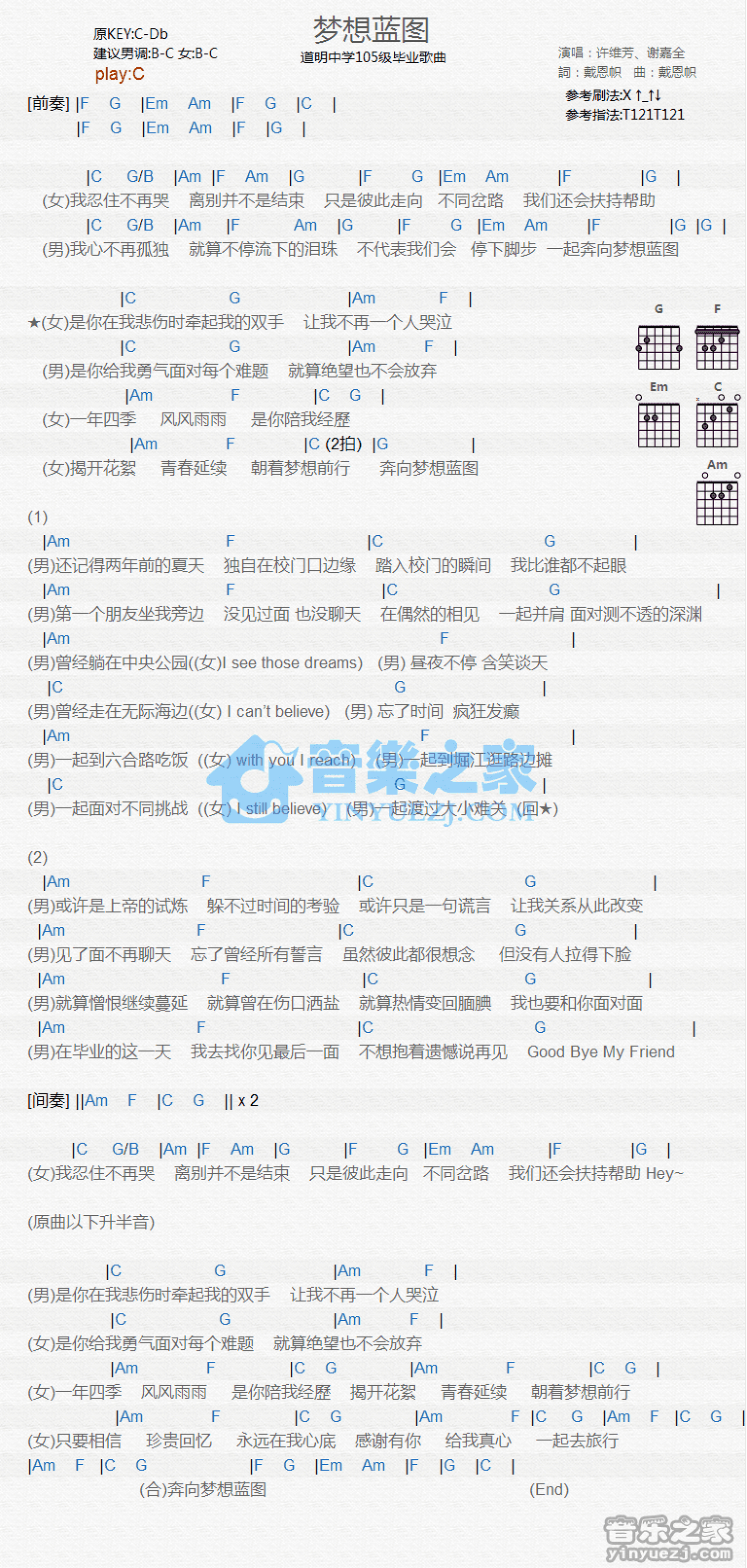 曲谱介绍: C调版许维芳/谢嘉全《梦想蓝图》吉他和弦弹唱谱