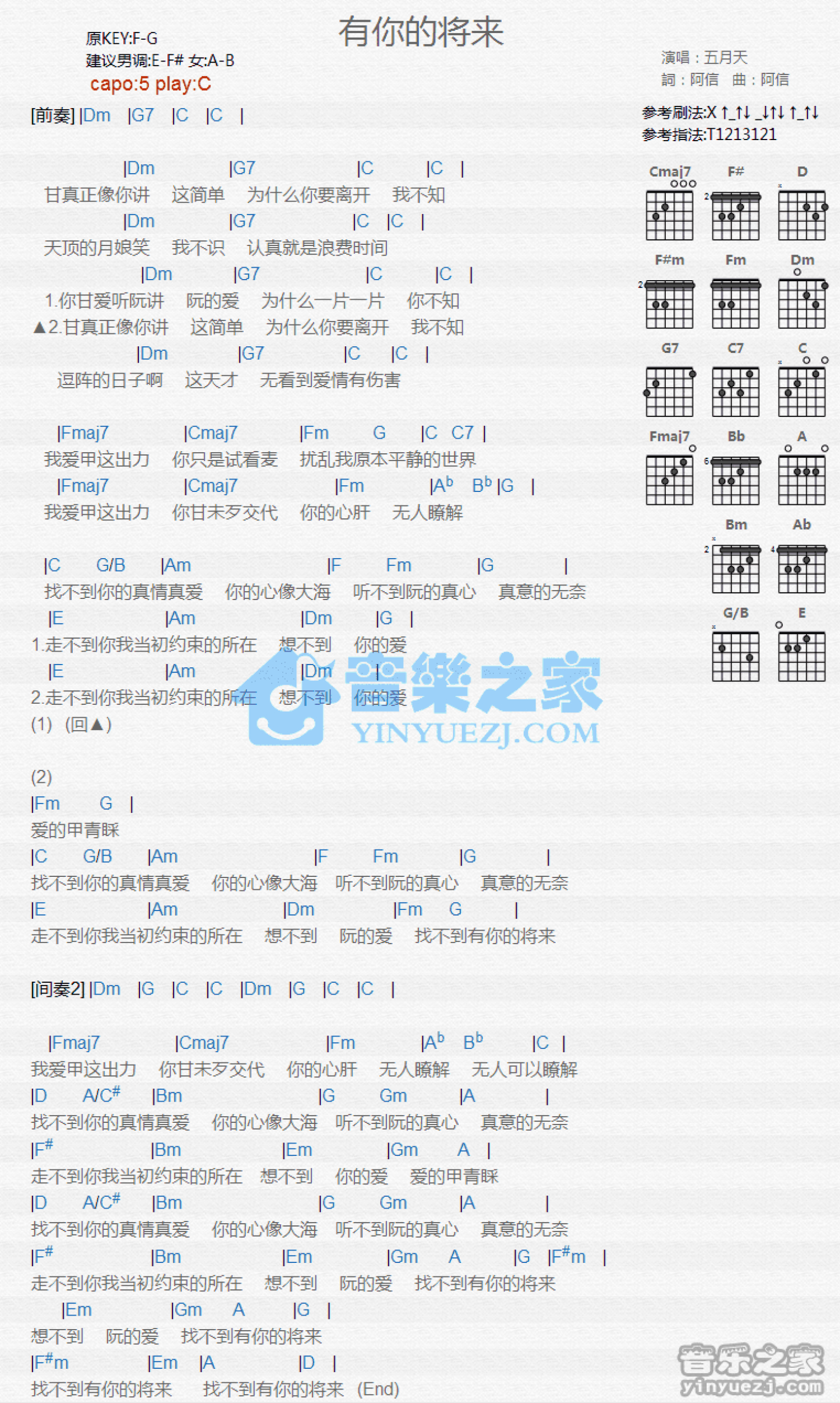 曲谱介绍: C调版五月天《有你的将来》吉他和弦弹唱谱
