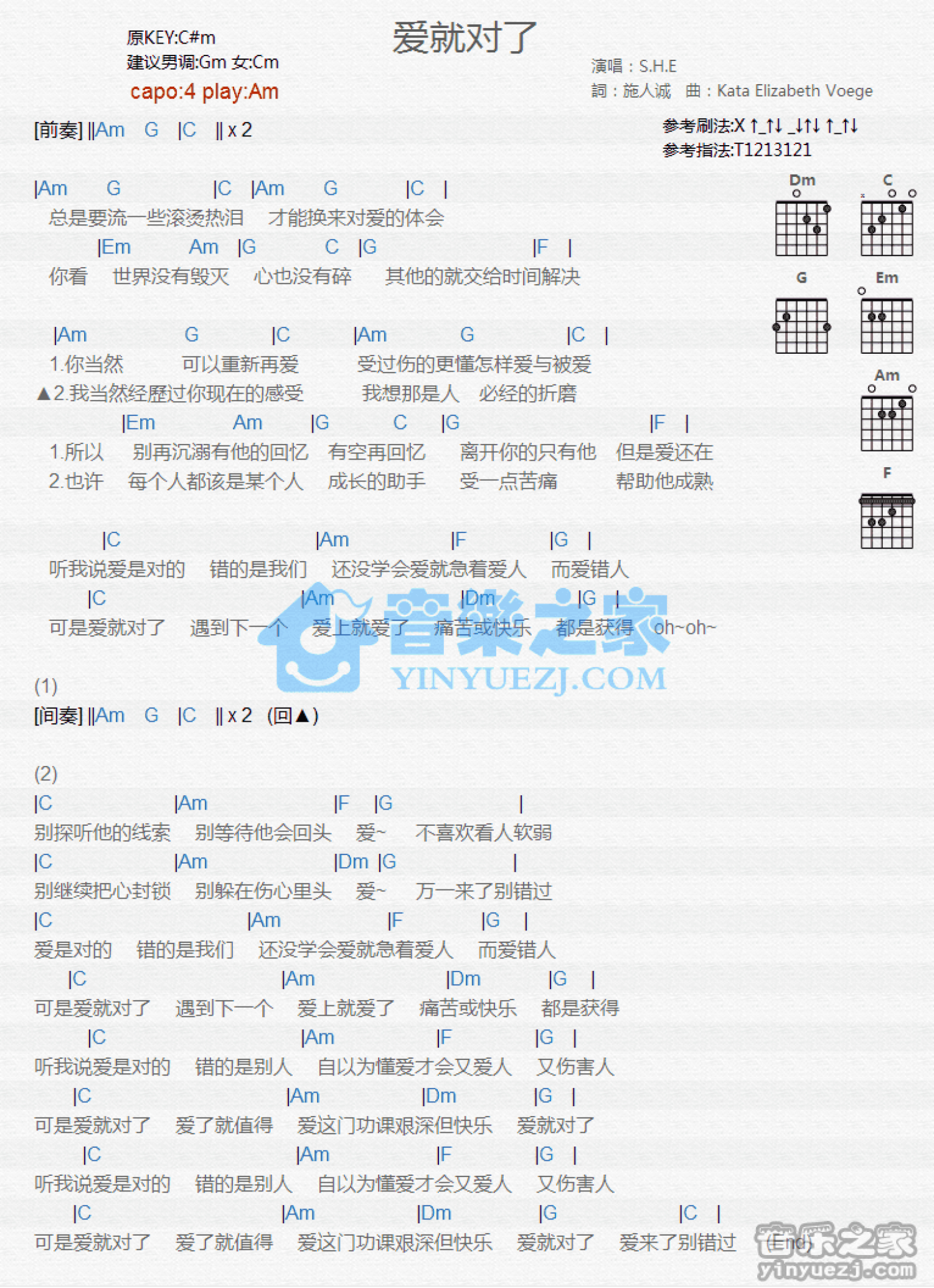 曲谱介绍: Am调版S.H.E《爱就对了》吉他和弦弹唱谱