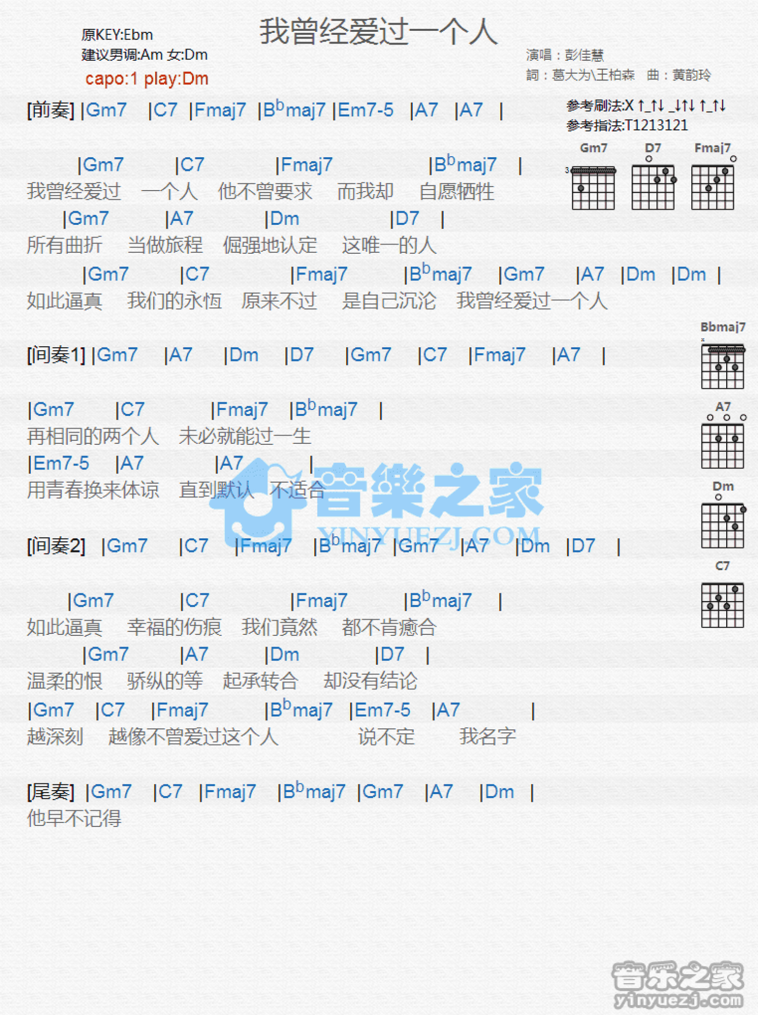 我曾经爱过一个人吉他谱 - 彭佳慧 - D调吉他弹唱谱 - 和弦谱