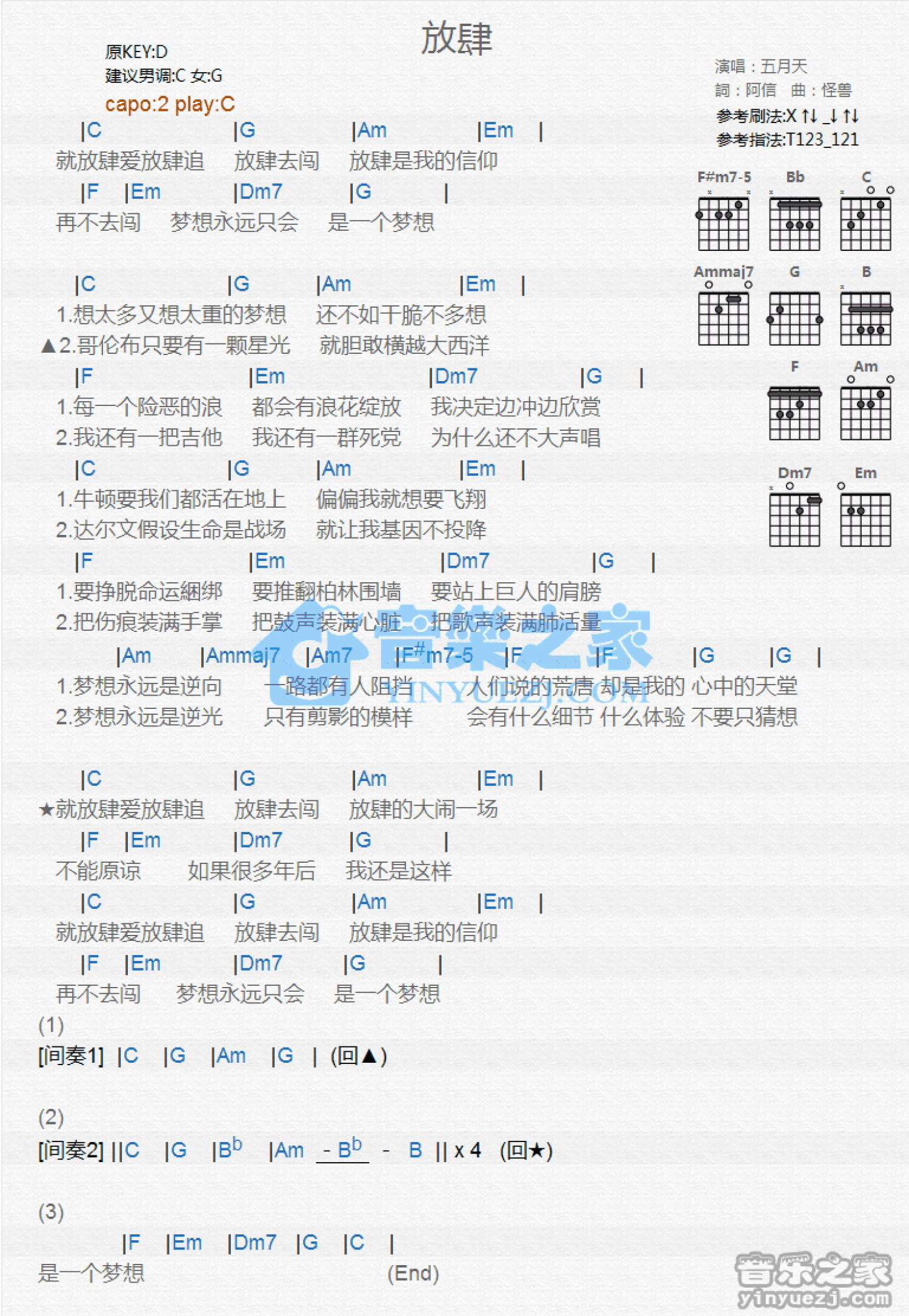 曲谱介绍: C调版五月天《放肆》吉他和弦弹唱谱