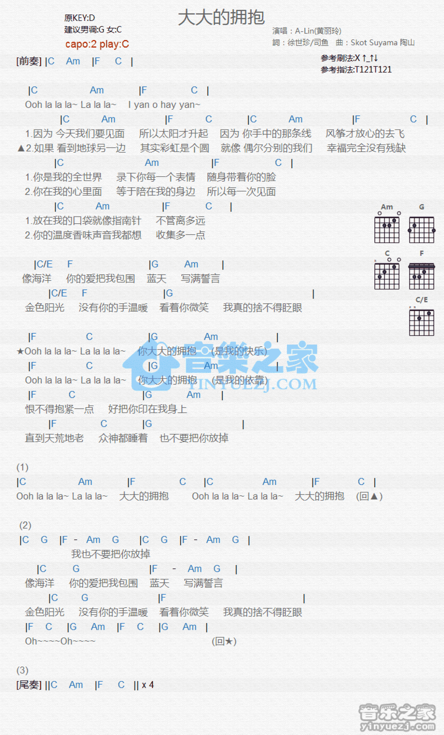 曲谱介绍: C调版A-Lin《大大的拥抱》吉他和弦弹唱谱