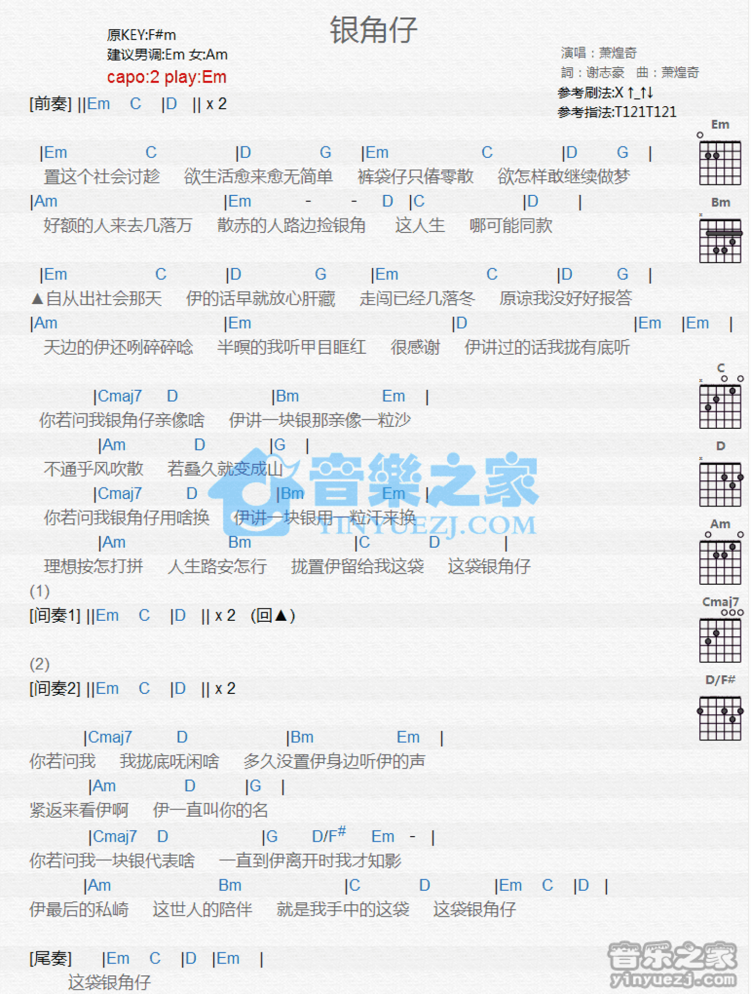 曲谱介绍: Em调版萧煌奇《银角仔》吉他和弦弹唱谱