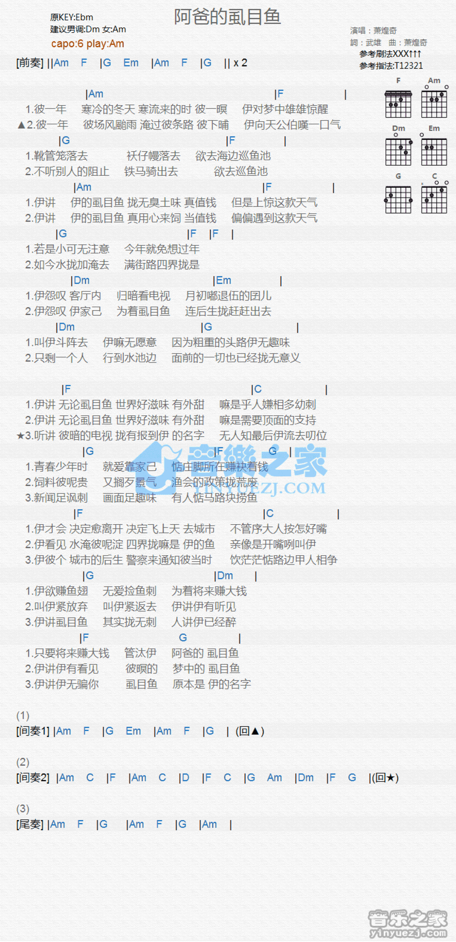 曲谱介绍: Am调版萧煌奇《阿爸的虱目鱼》吉他和弦弹唱谱