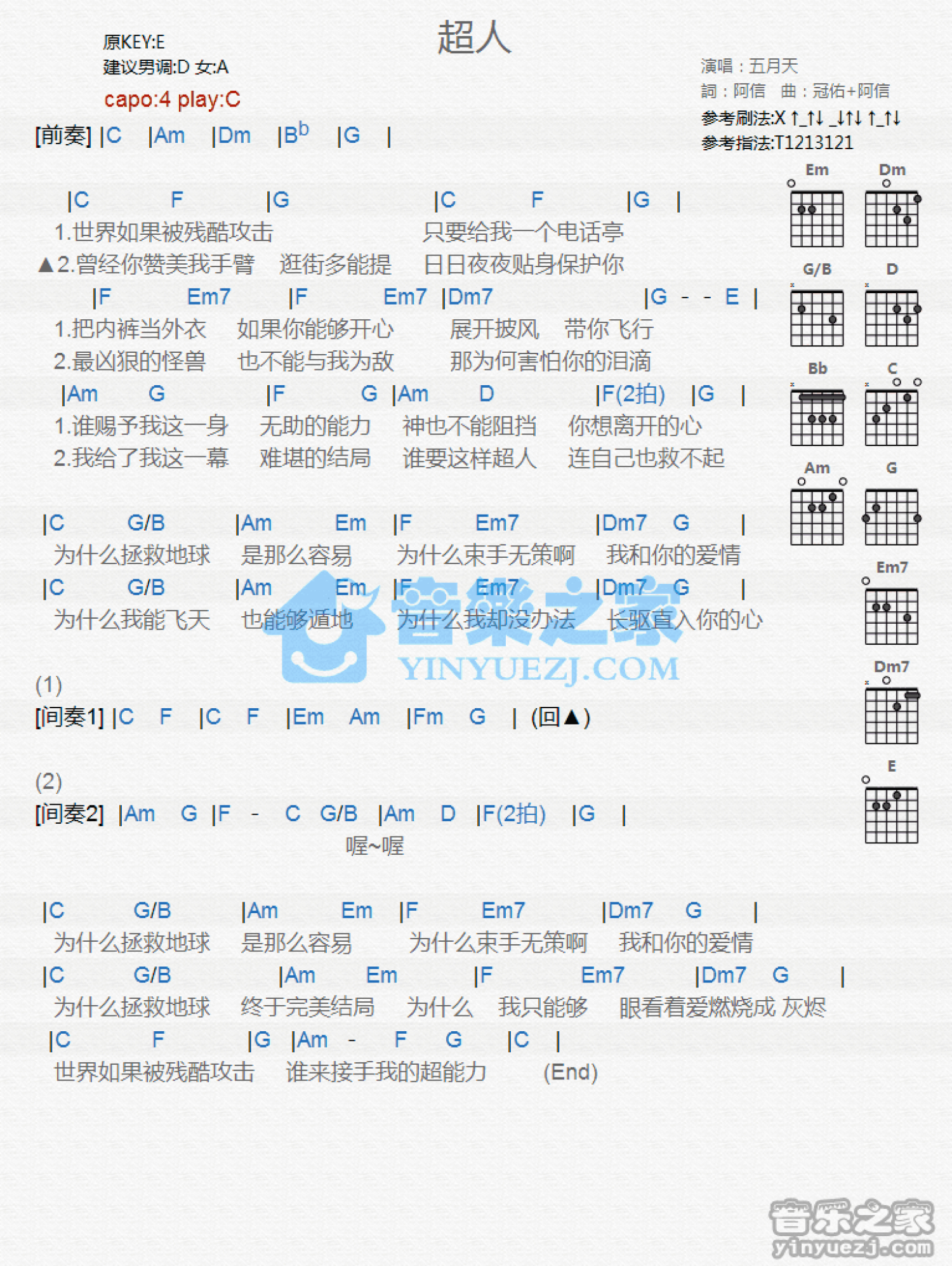 曲谱介绍: C调版五月天《超人》吉他和弦弹唱谱