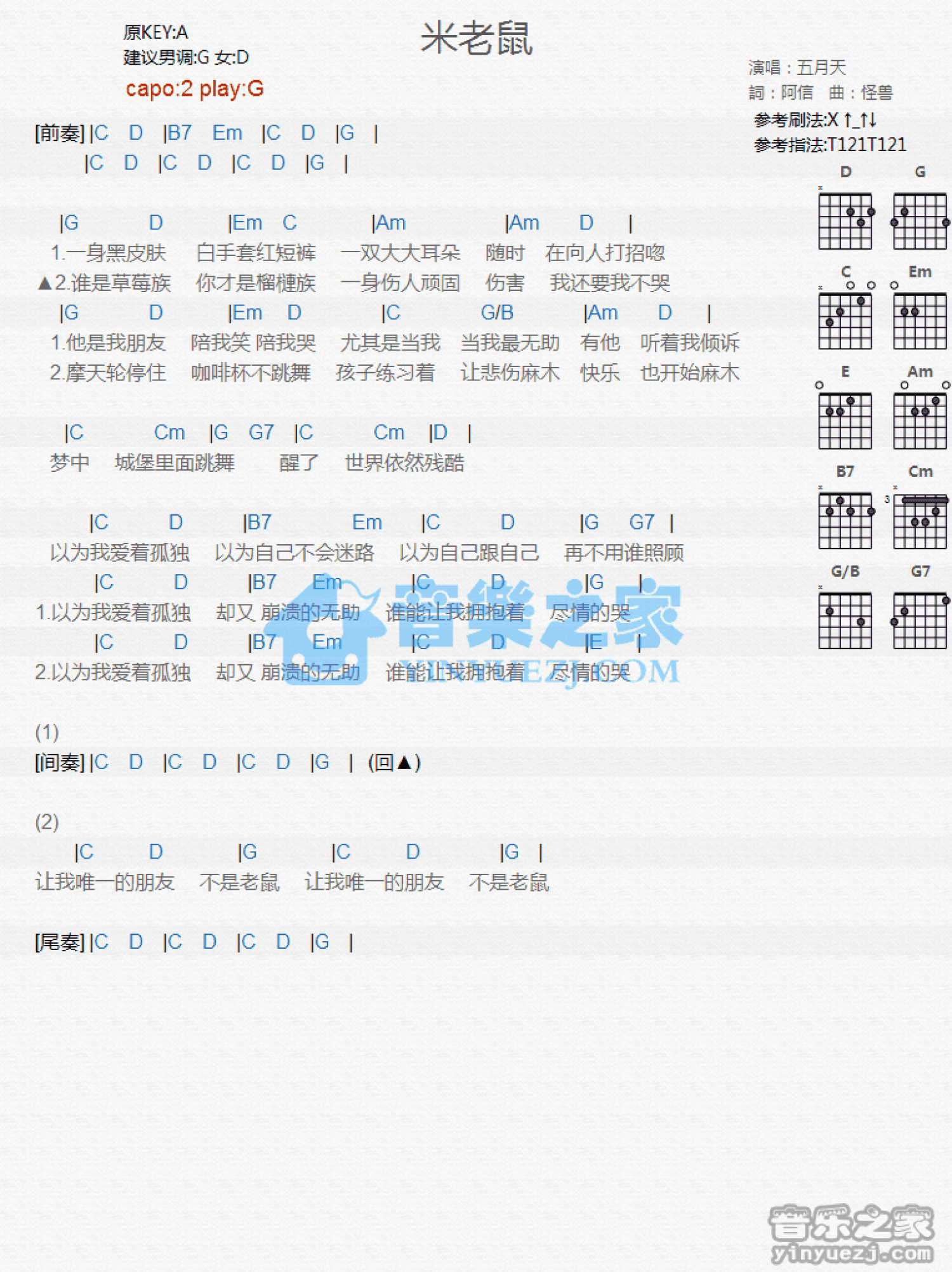 曲谱介绍: G调版五月天《米老鼠》吉他和弦弹唱谱
