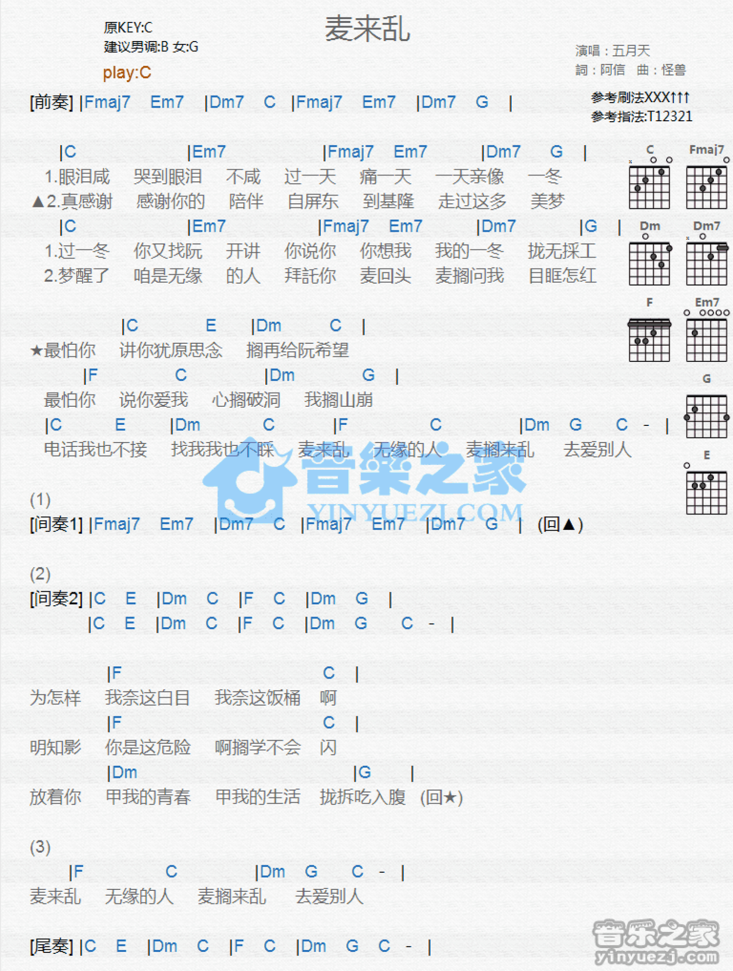 曲谱介绍: C调版五月天《麦来乱》吉他和弦弹唱谱