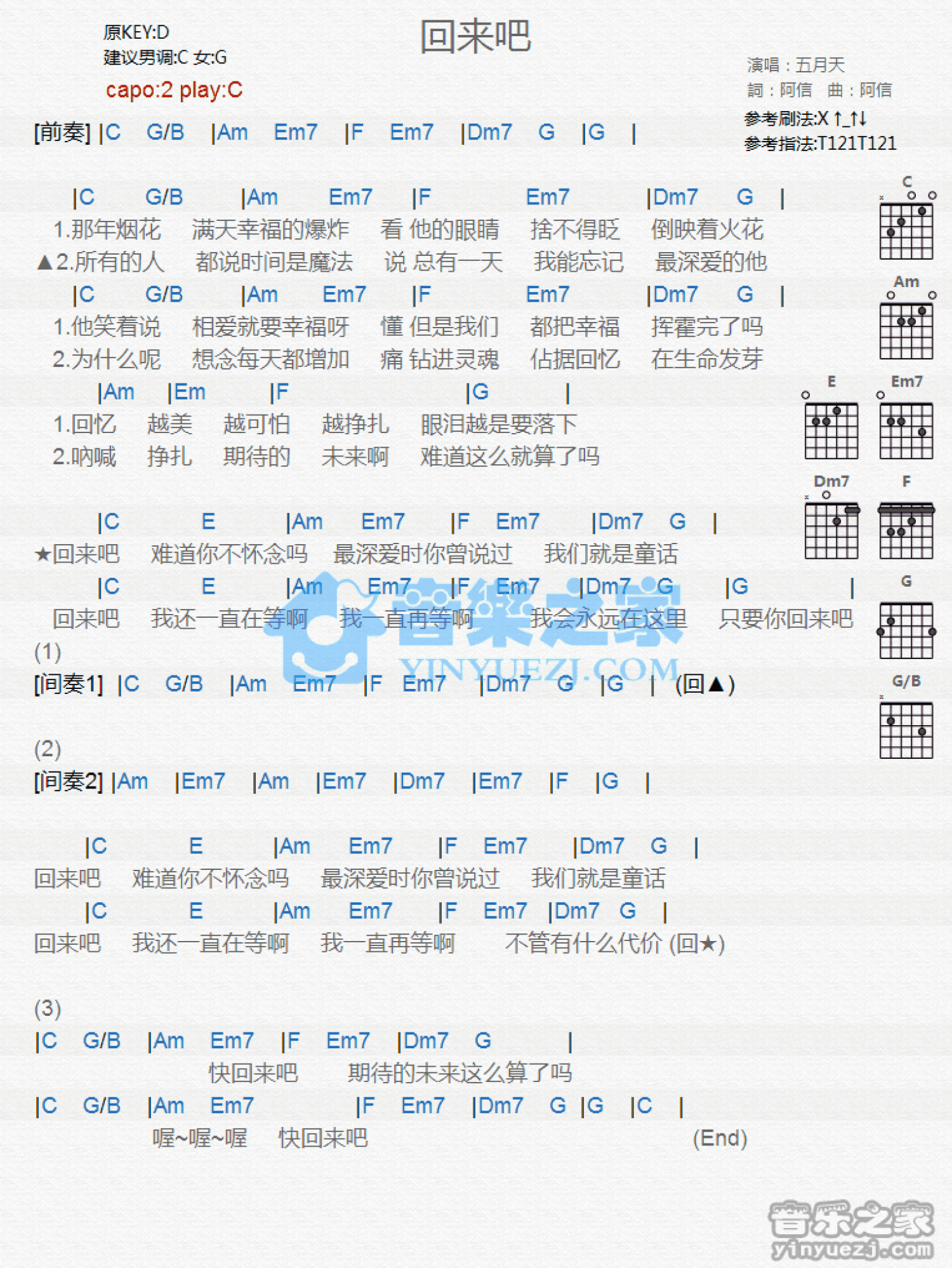 曲谱介绍: C调版《回来吧》吉他和弦弹唱谱