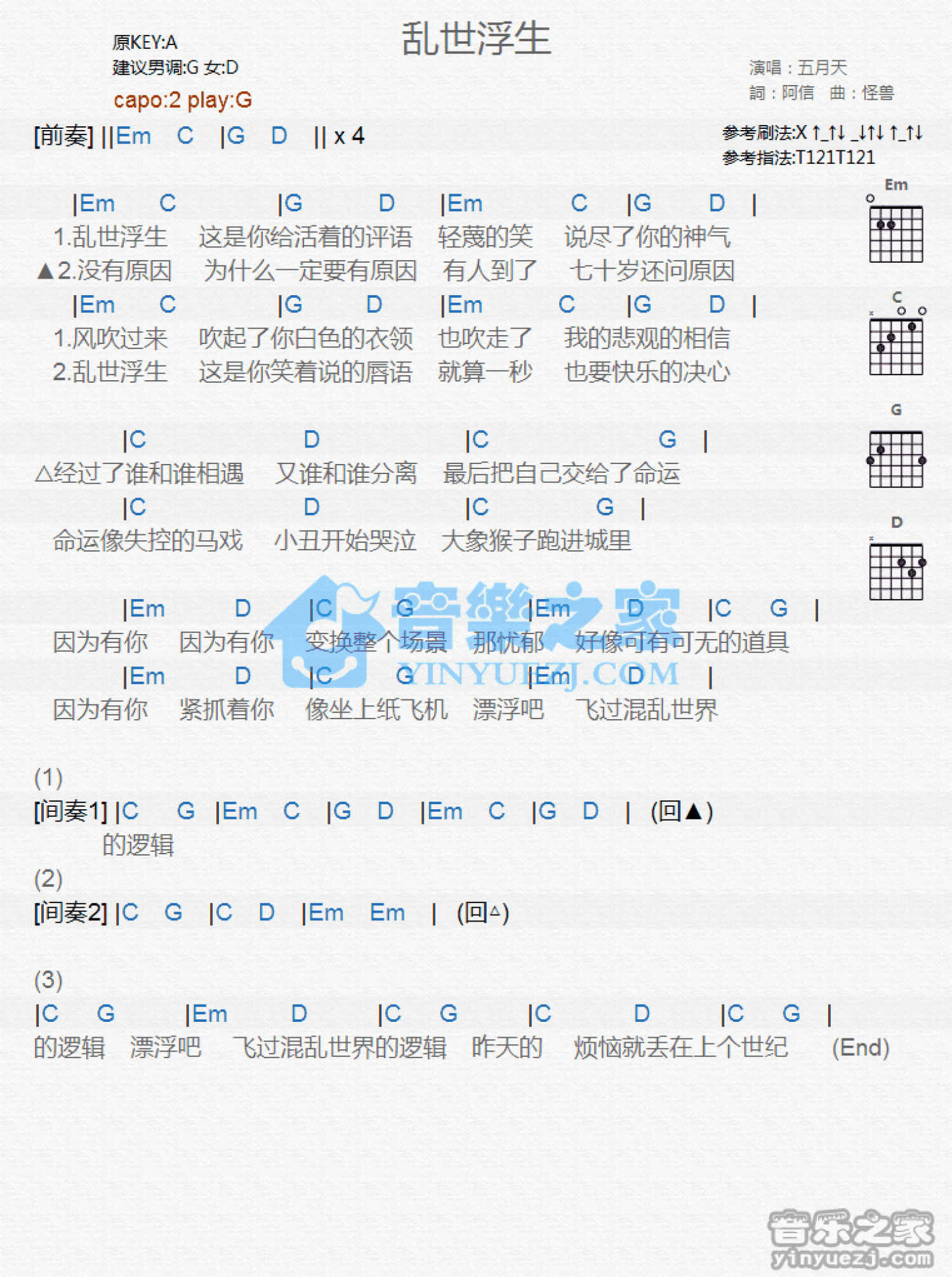 乱世浮生吉他谱 - 五月天 - G调吉他弹唱谱 - 和弦谱