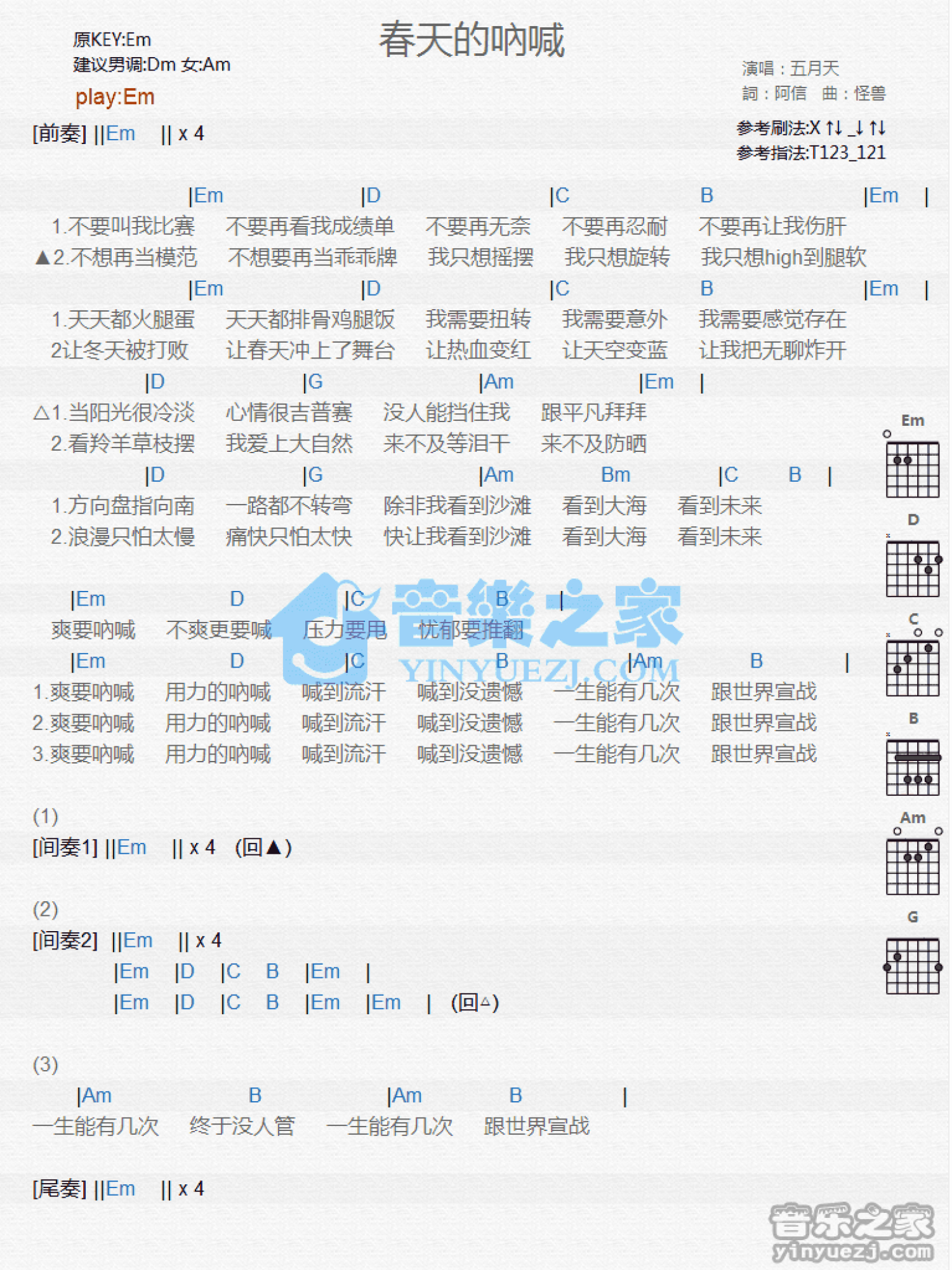 曲谱介绍: Em调版《春天的呐喊》吉他和弦弹唱谱