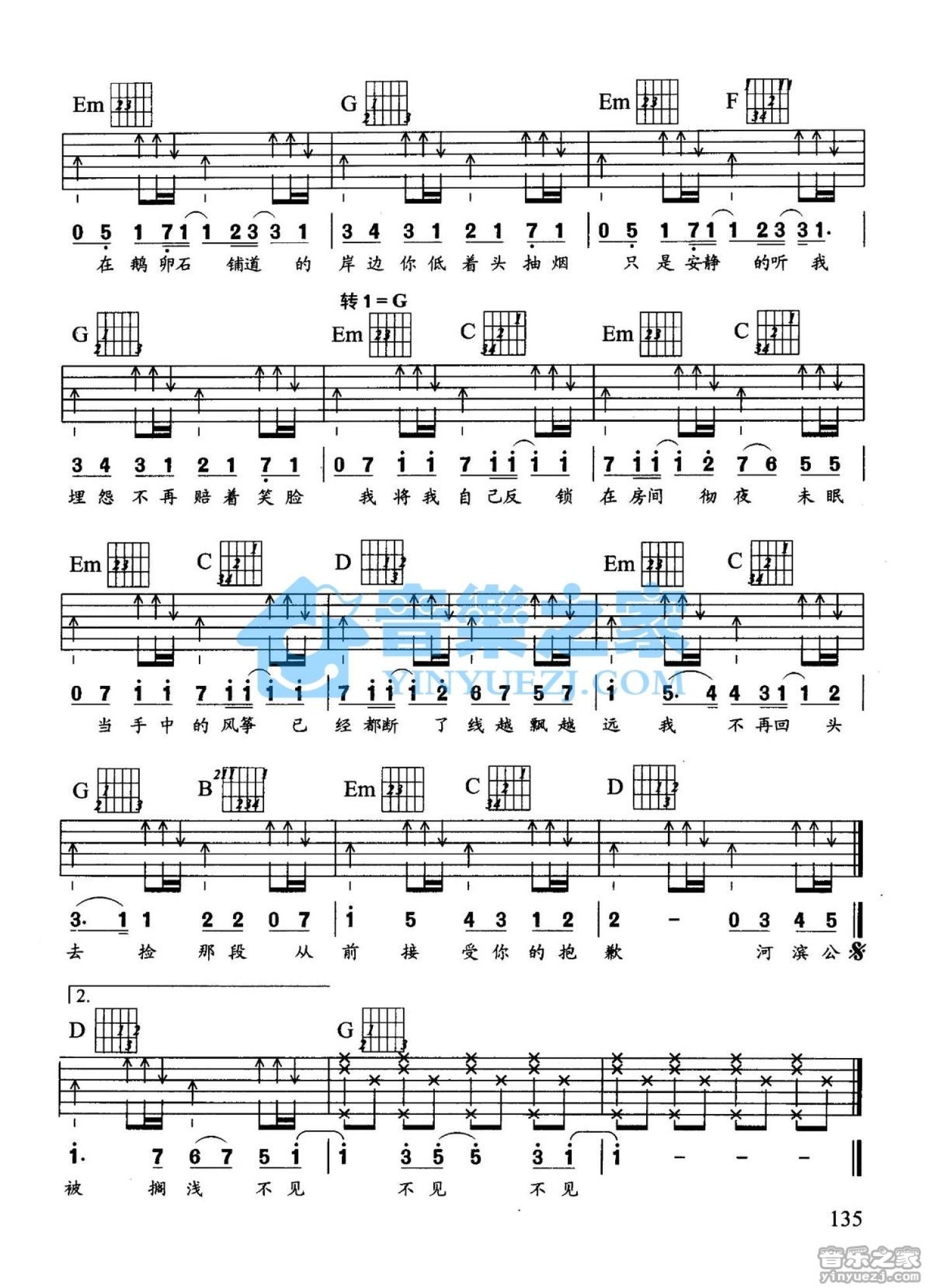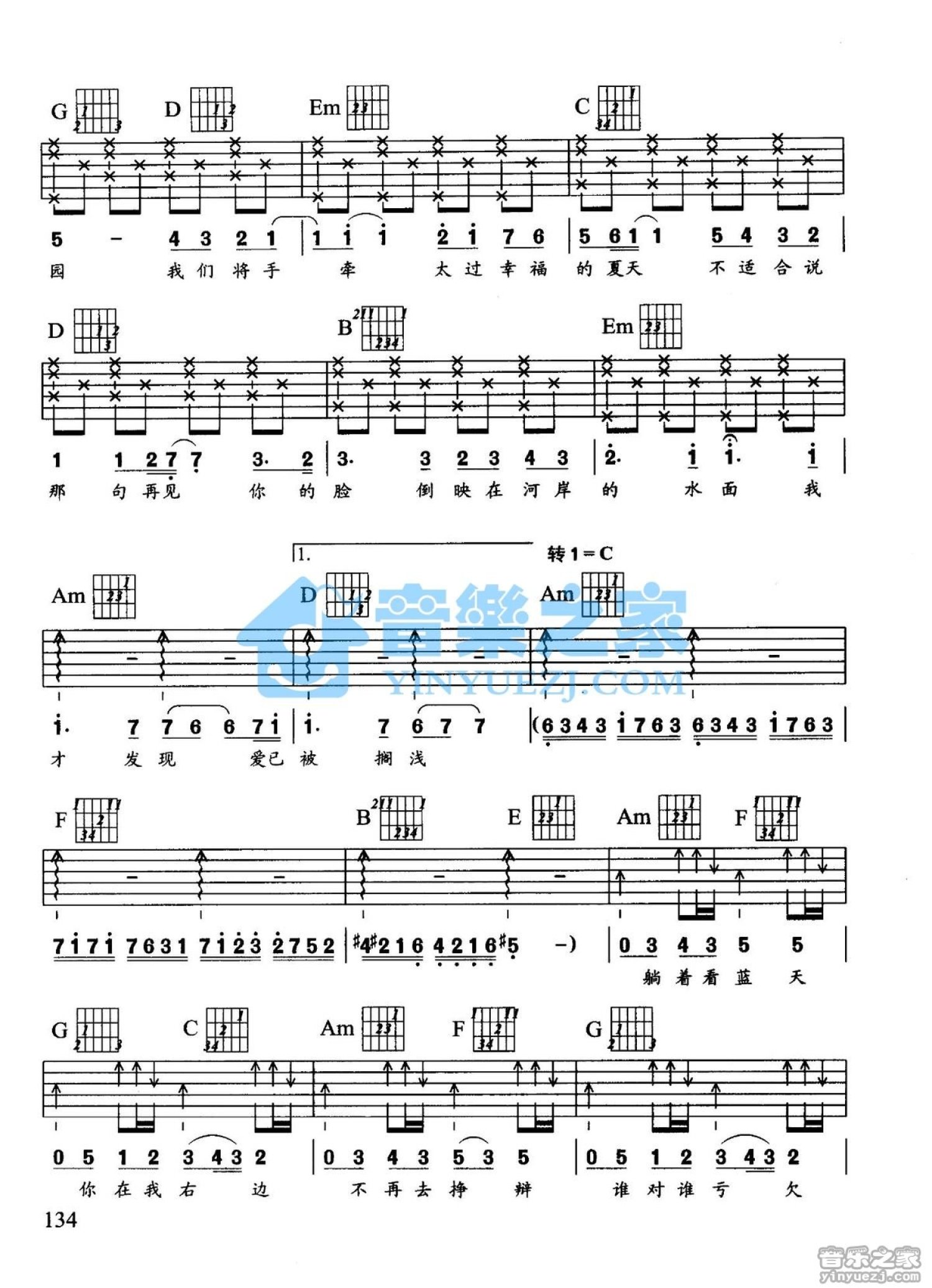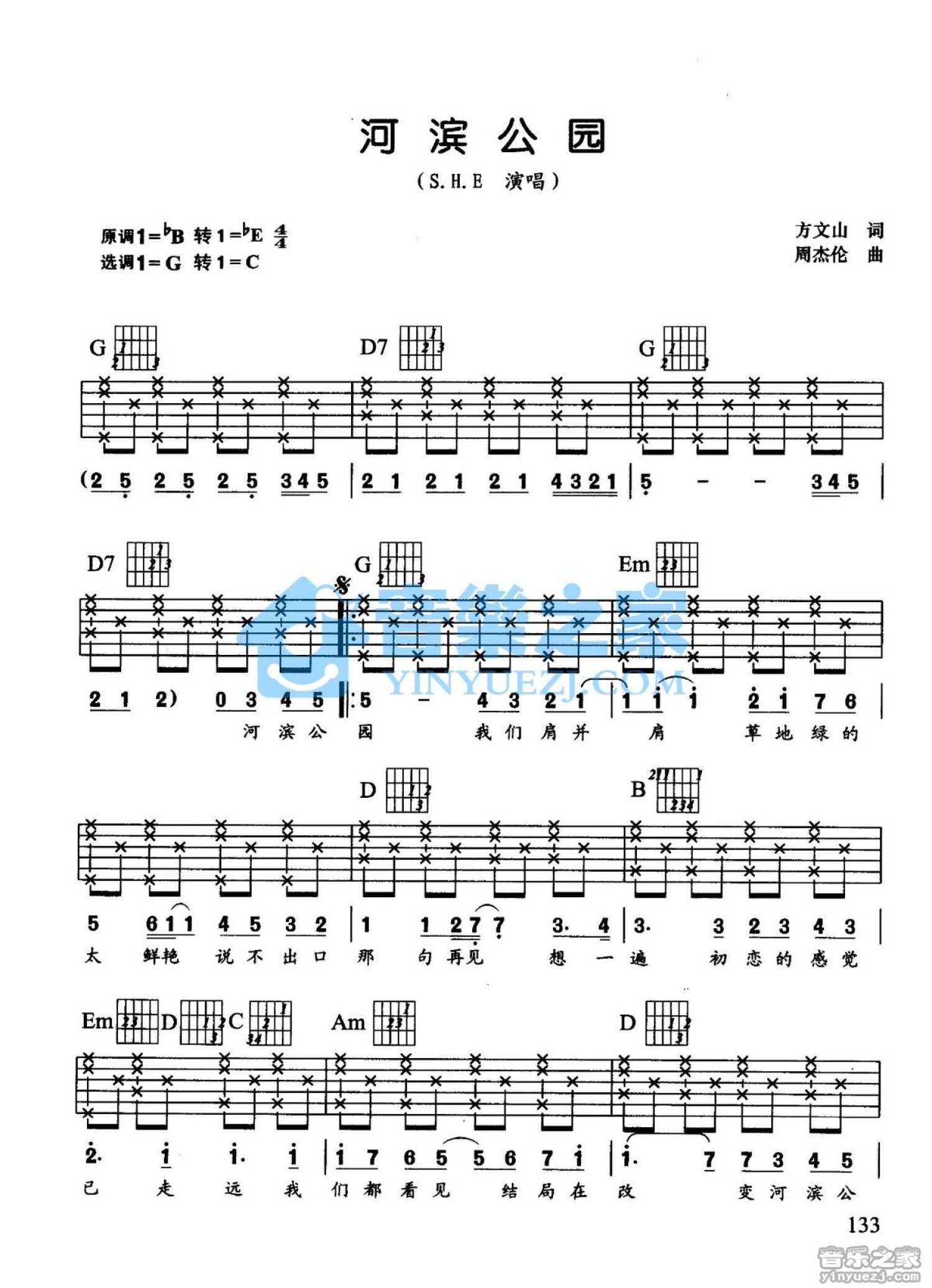 曲谱介绍: G调版《河滨公园》吉他弹唱六线谱