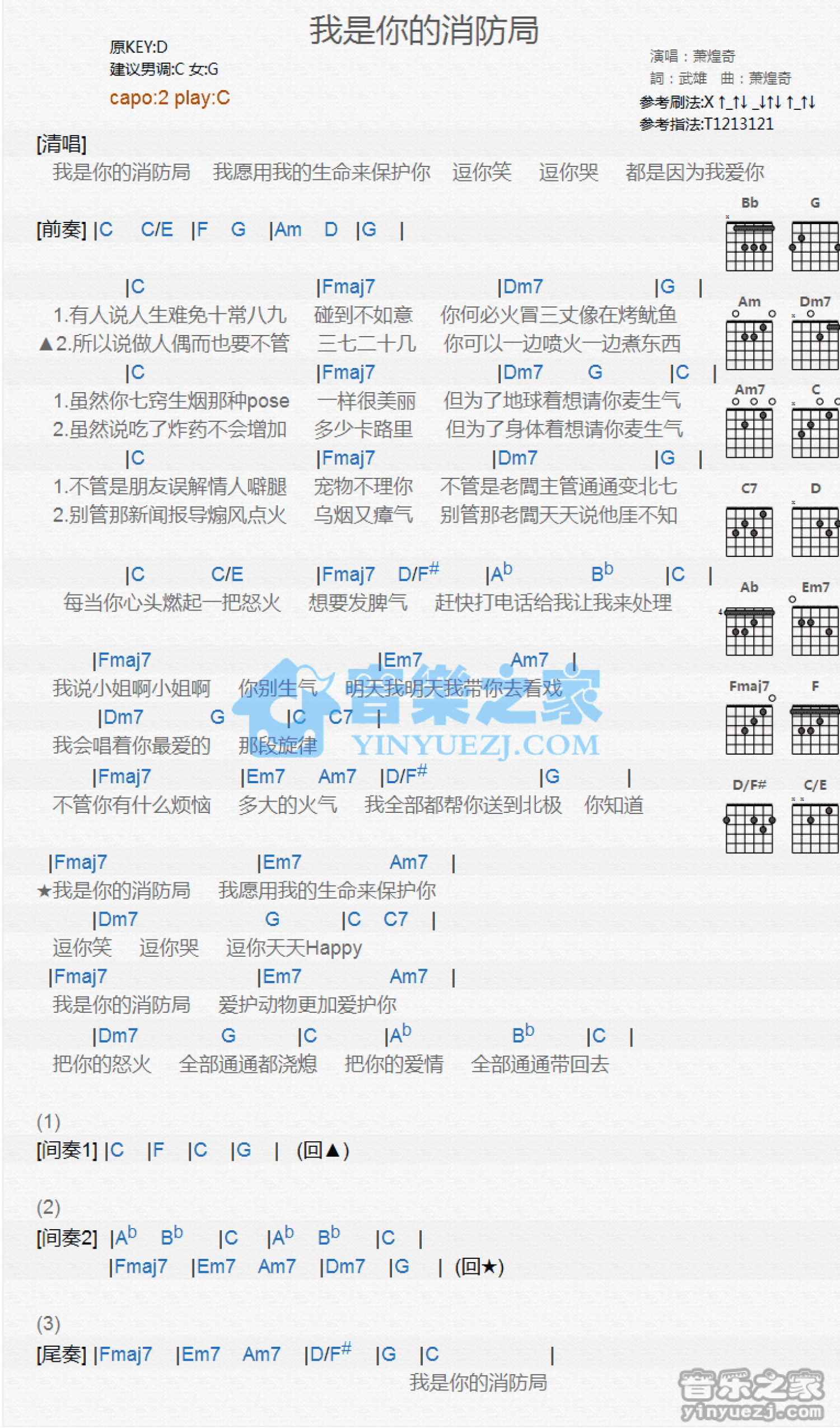 曲谱介绍: C调版萧煌奇《我是你的消防局》吉他和弦弹唱谱