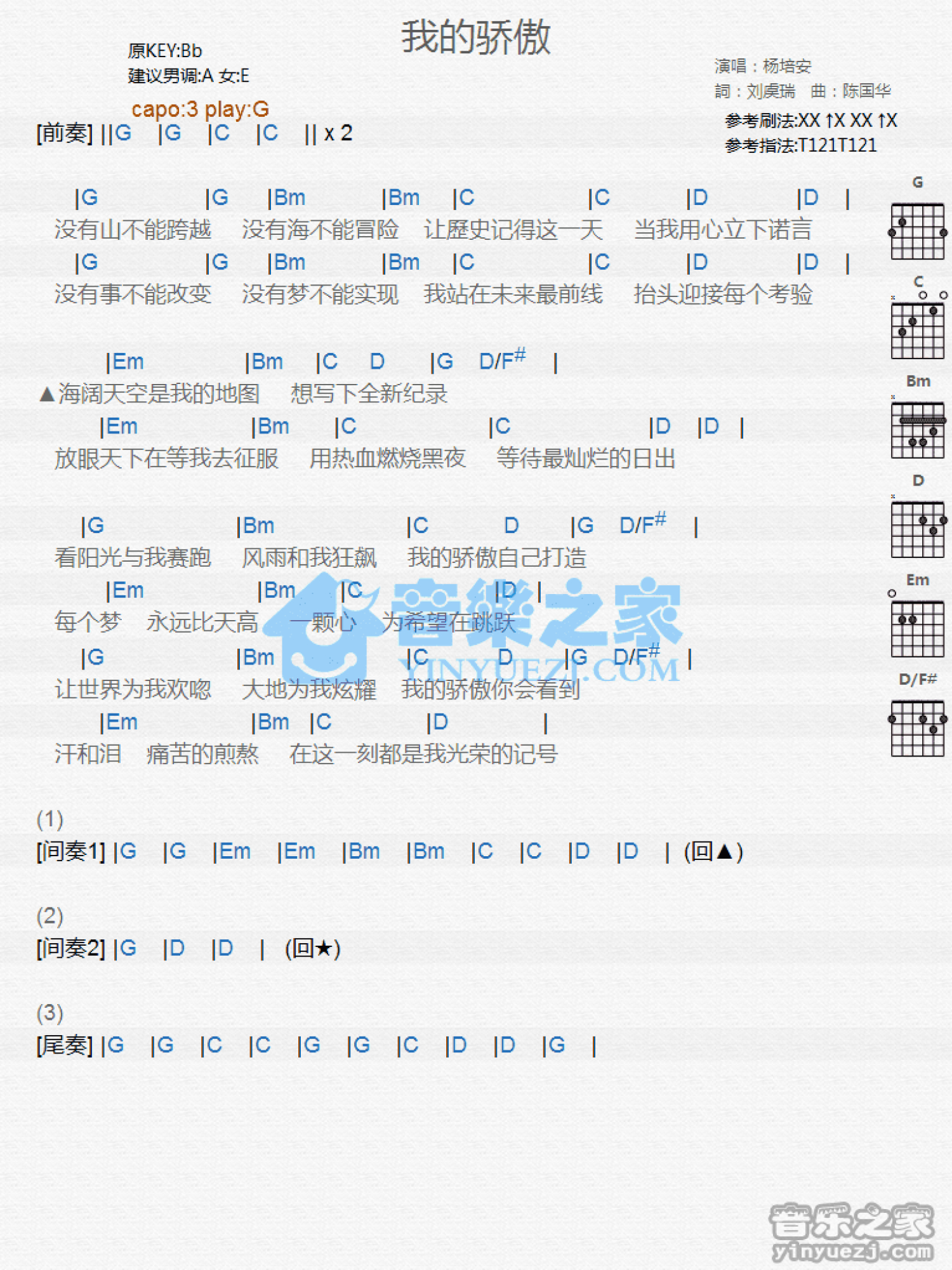 曲谱介绍: G调版杨培安《我的骄傲》吉他和弦弹唱谱