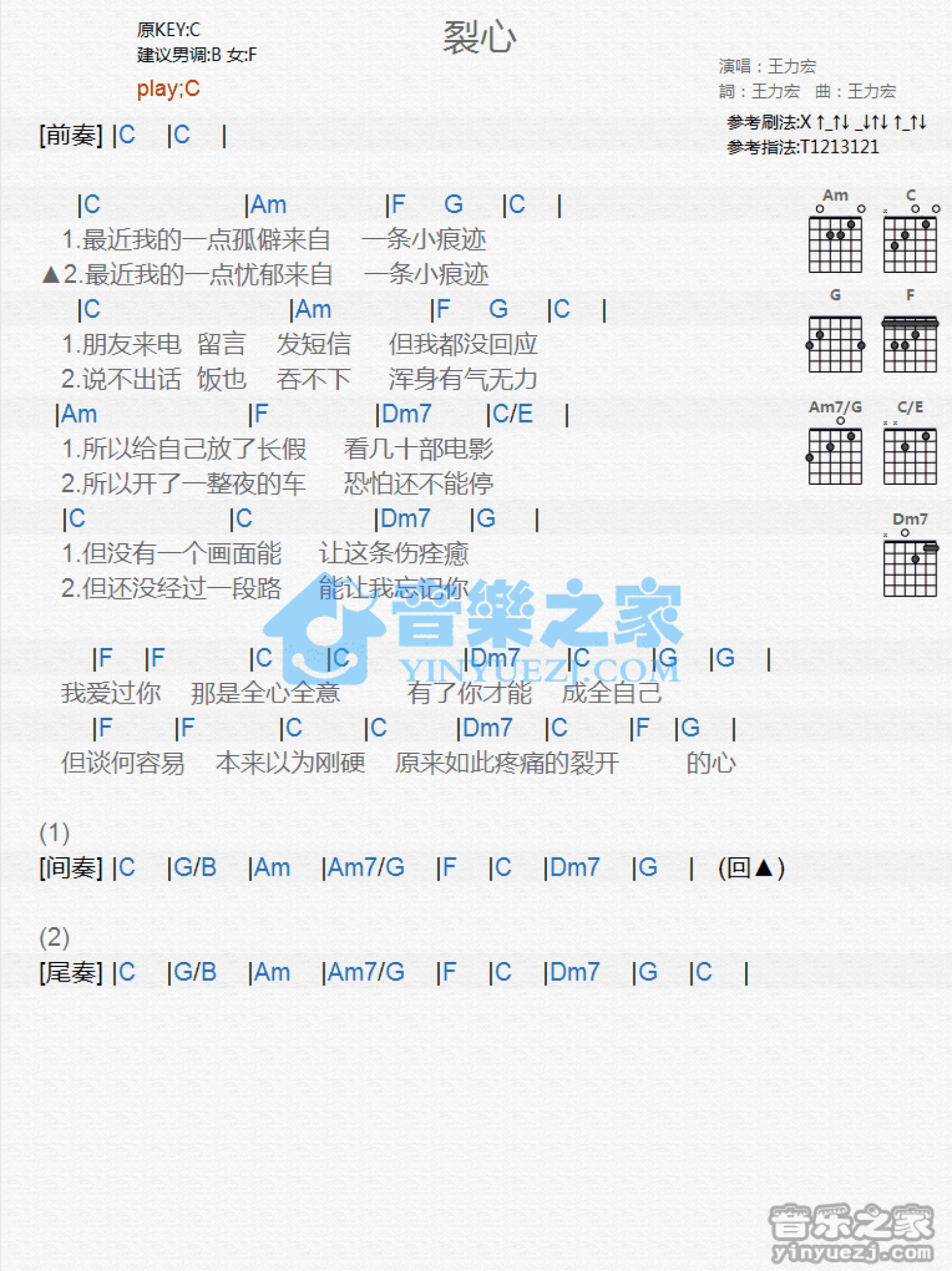 曲谱介绍: C调版王力宏《裂心》吉他和弦弹唱谱