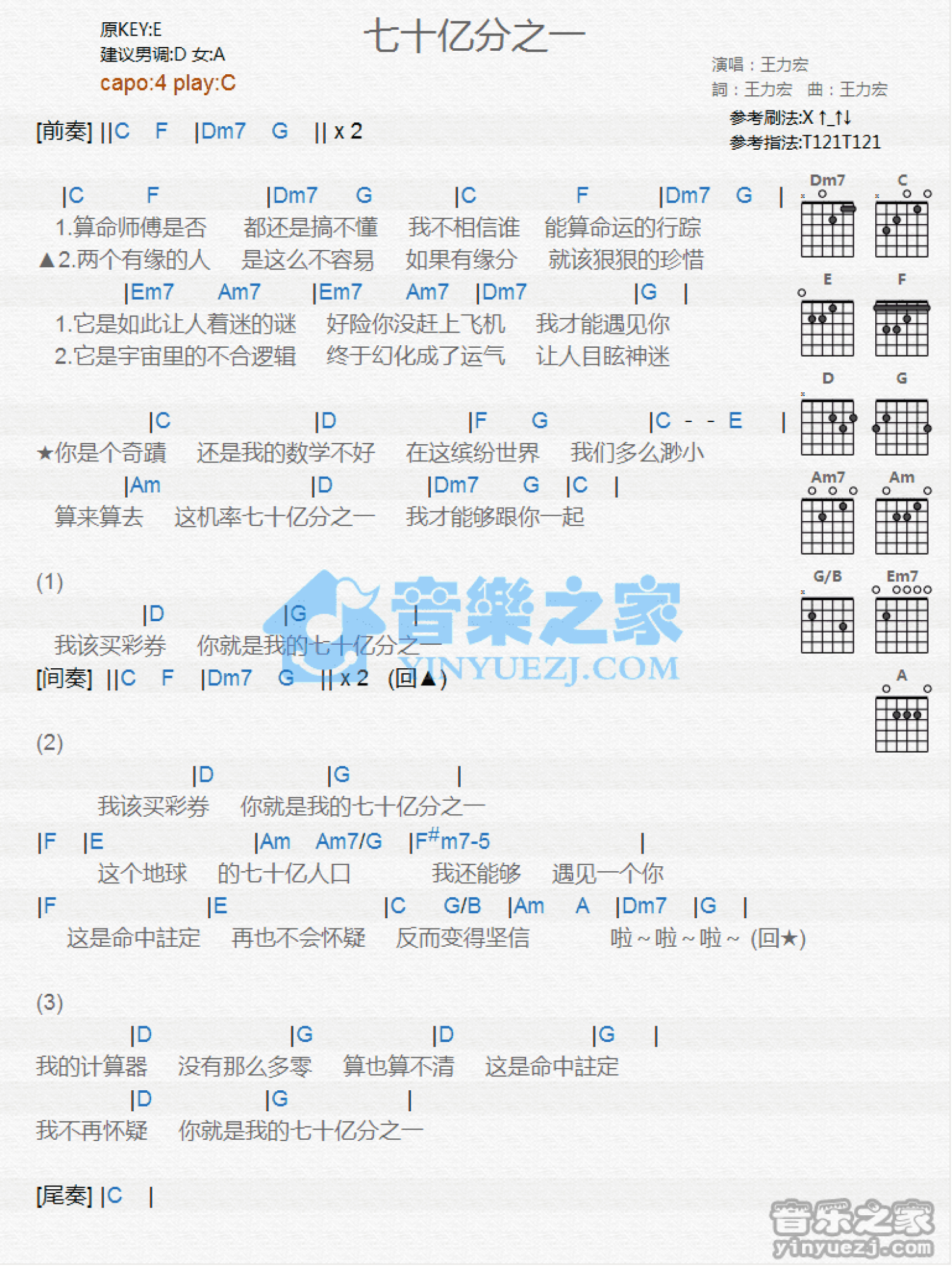 曲谱介绍: C调版王力宏《七十亿分之一》吉他和弦弹唱谱