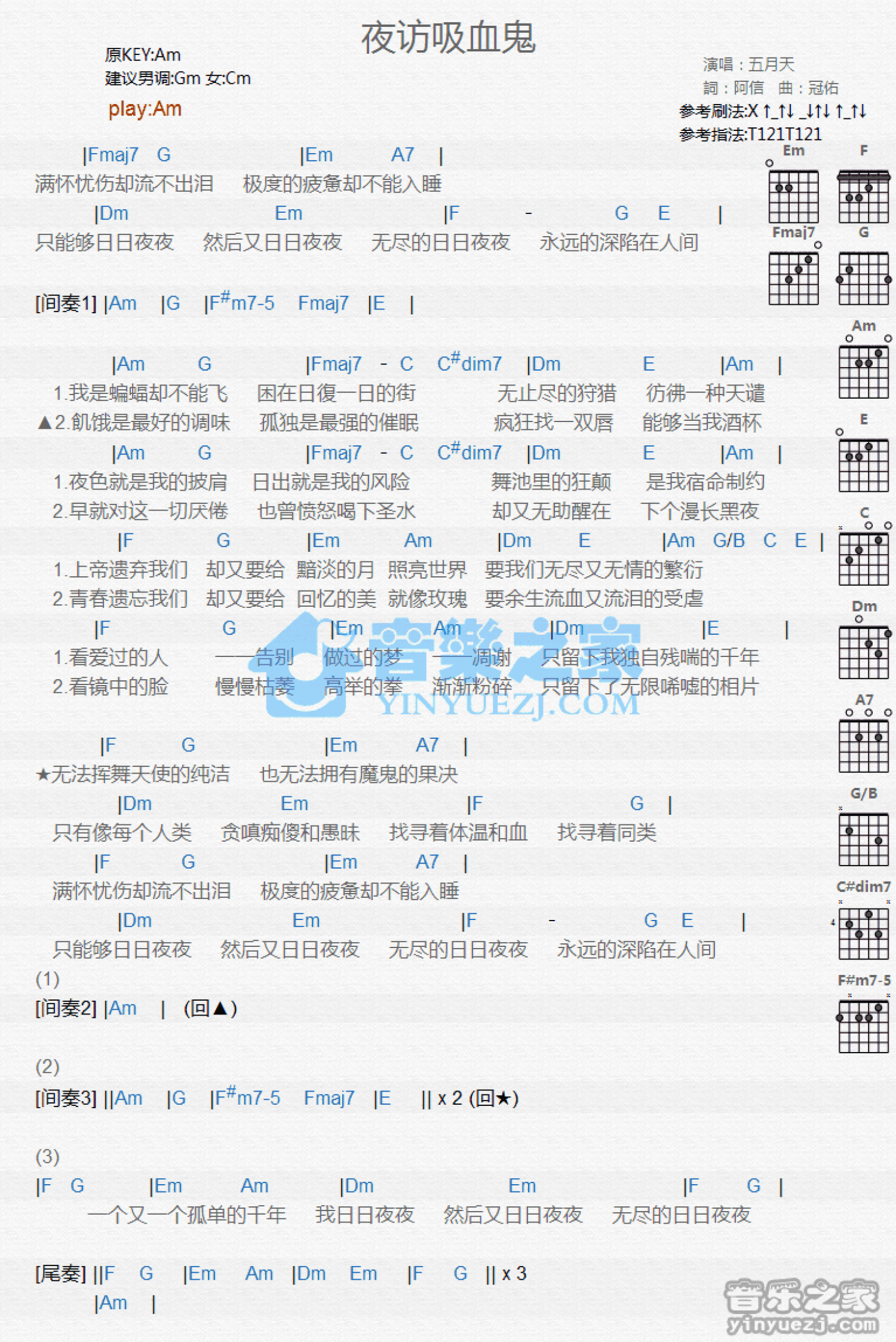 曲谱介绍: Am调版五月天《夜访吸血鬼》吉他和弦弹唱谱