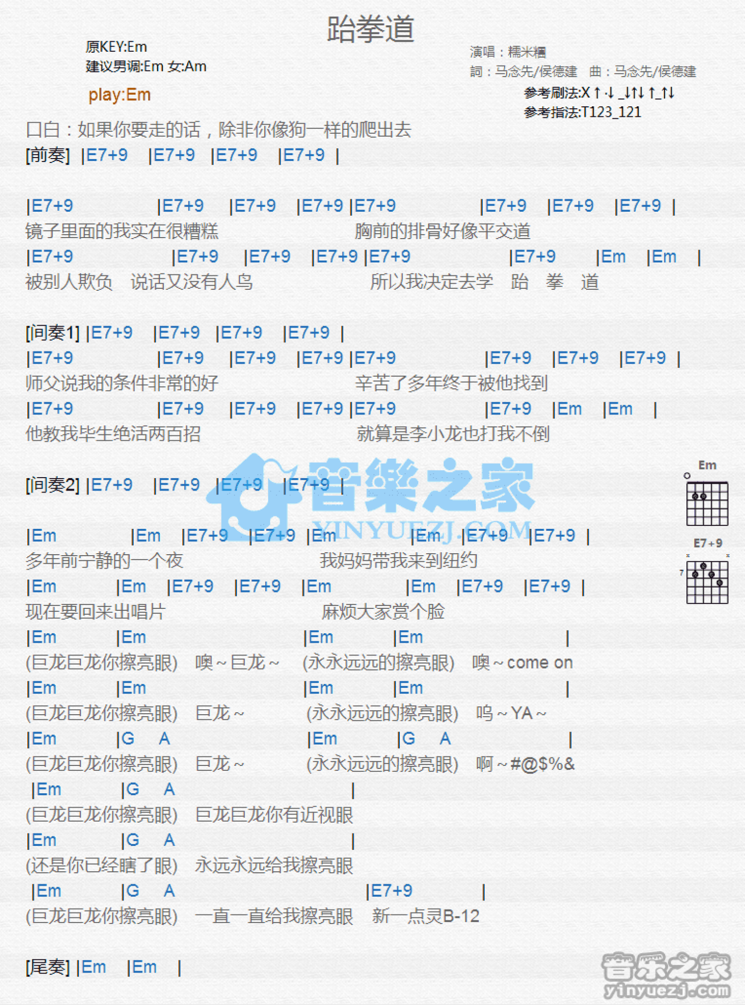 曲谱介绍: Em调版糯米团《跆拳道》吉他和弦弹唱谱