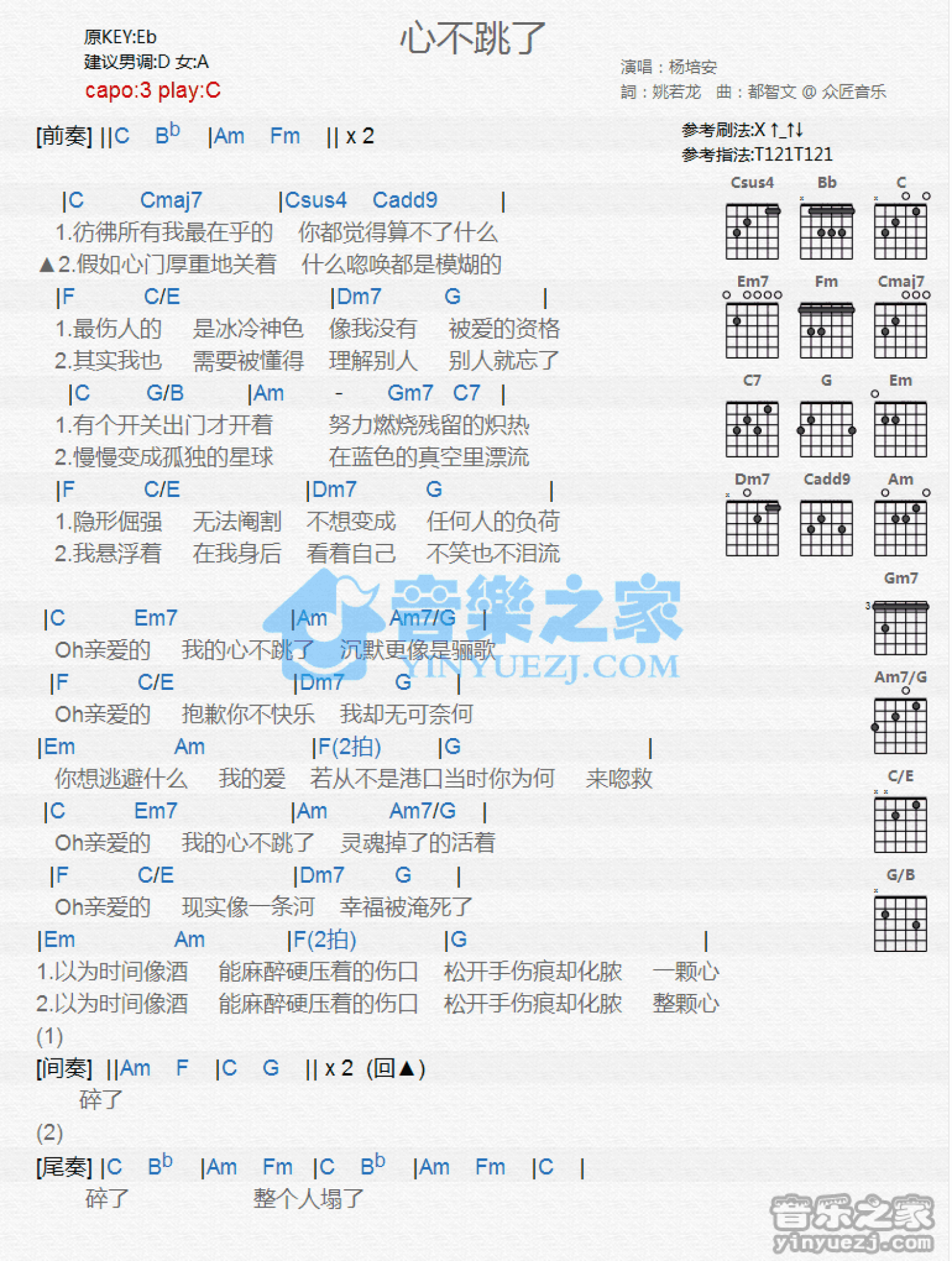 曲谱介绍: C调版杨培安《心不跳了》吉他和弦弹唱谱