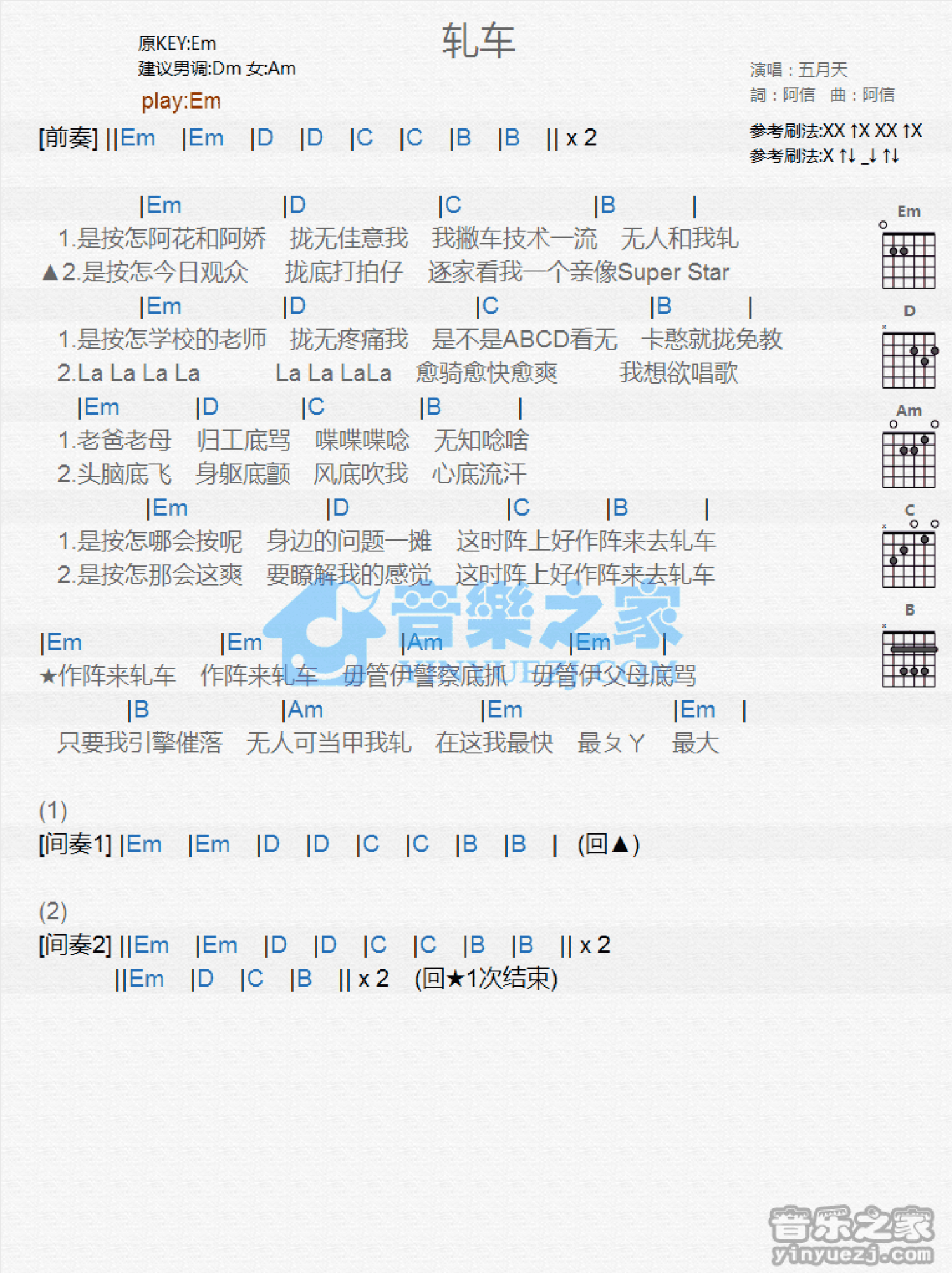 曲谱介绍: Em调版《轧车》吉他和弦弹唱谱