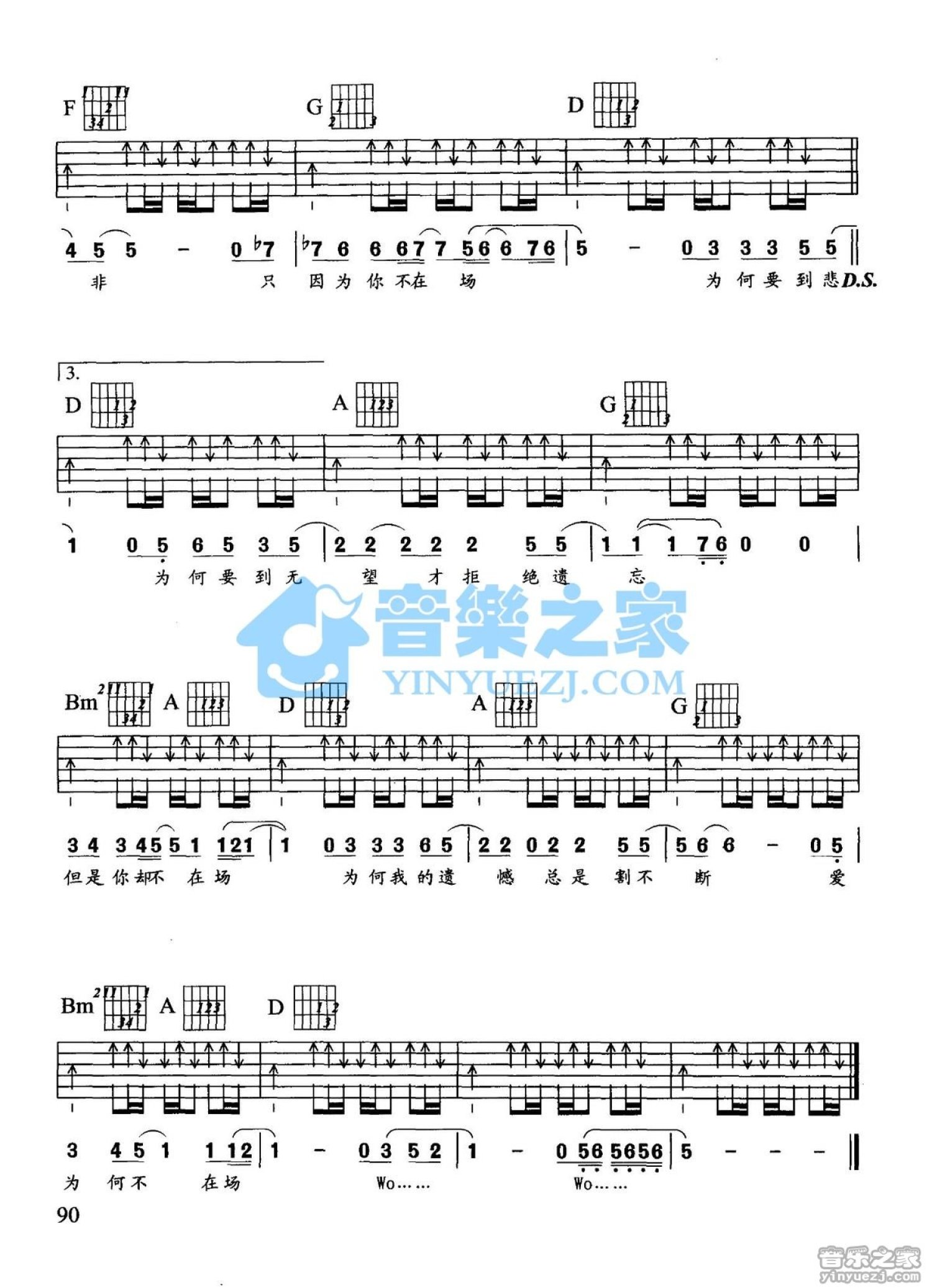 曲谱介绍: D调版《不在场》吉他弹唱六线谱