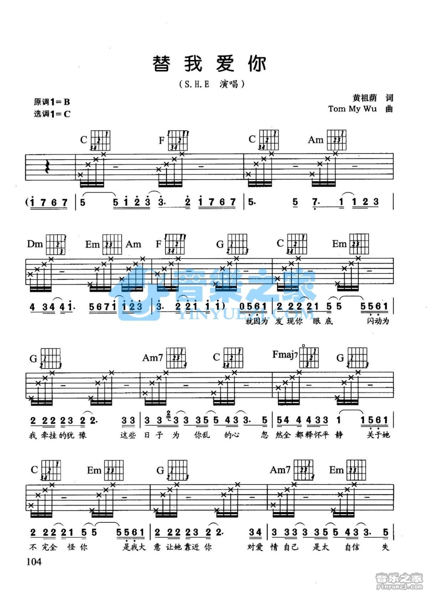 曲谱介绍: C调版S.H.E《替我爱你》吉他弹唱六线谱