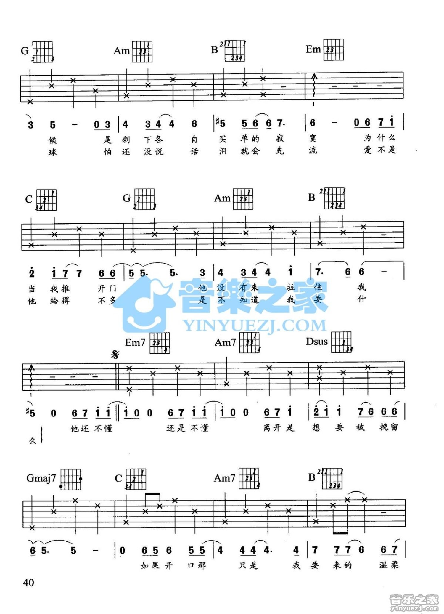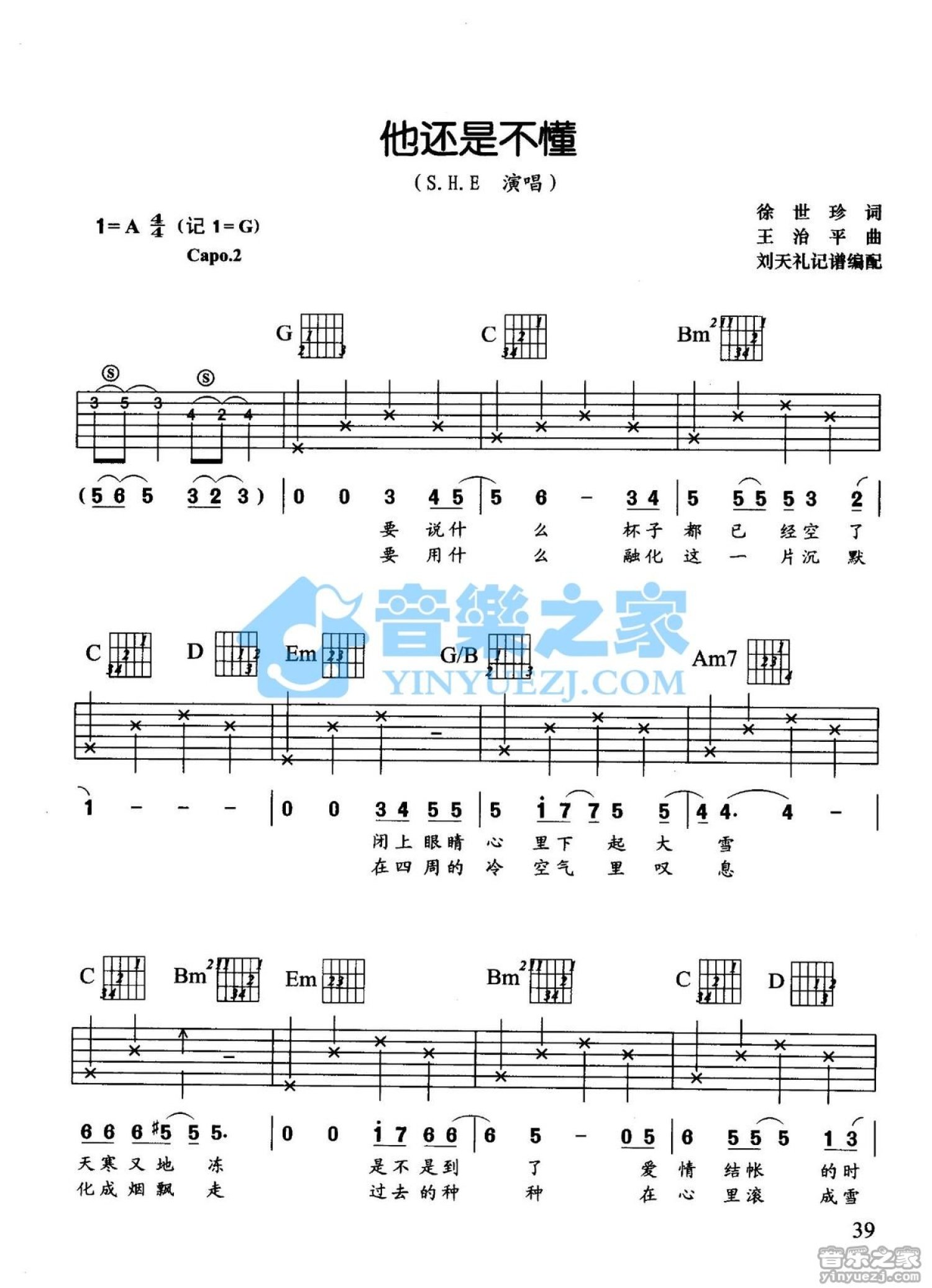 曲谱介绍: G调版S.H.E《他还是不懂》吉他弹唱六线谱
