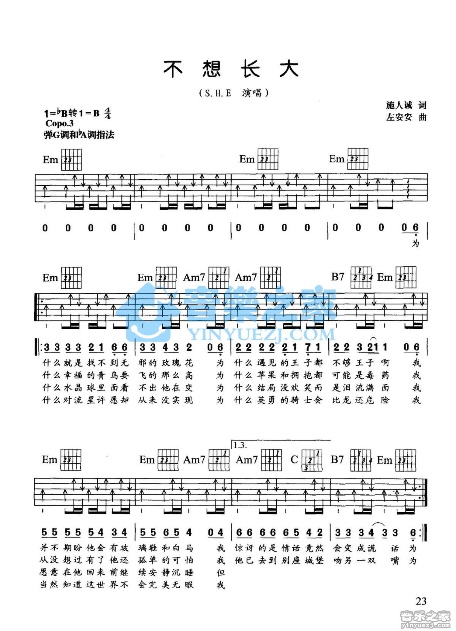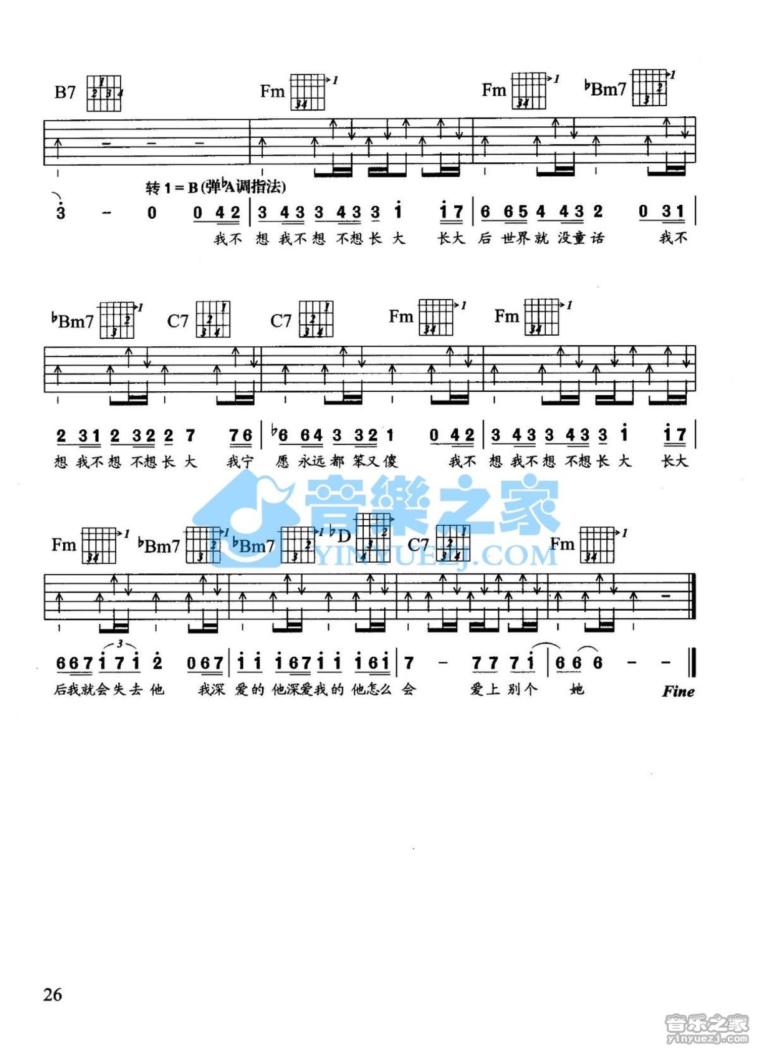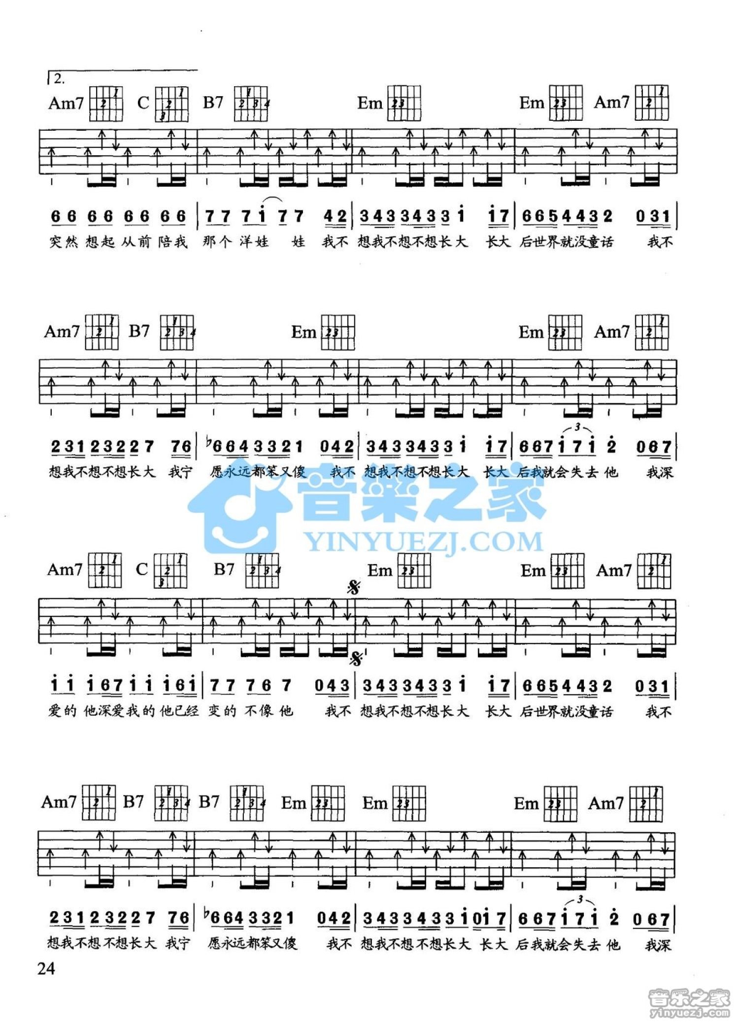 曲谱介绍: G调版《不想长大》吉他弹唱六线谱
