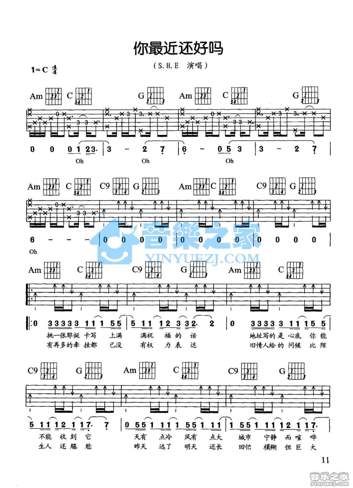 你最近还好吗吉他谱 - S.H.E - C调吉他弹唱谱