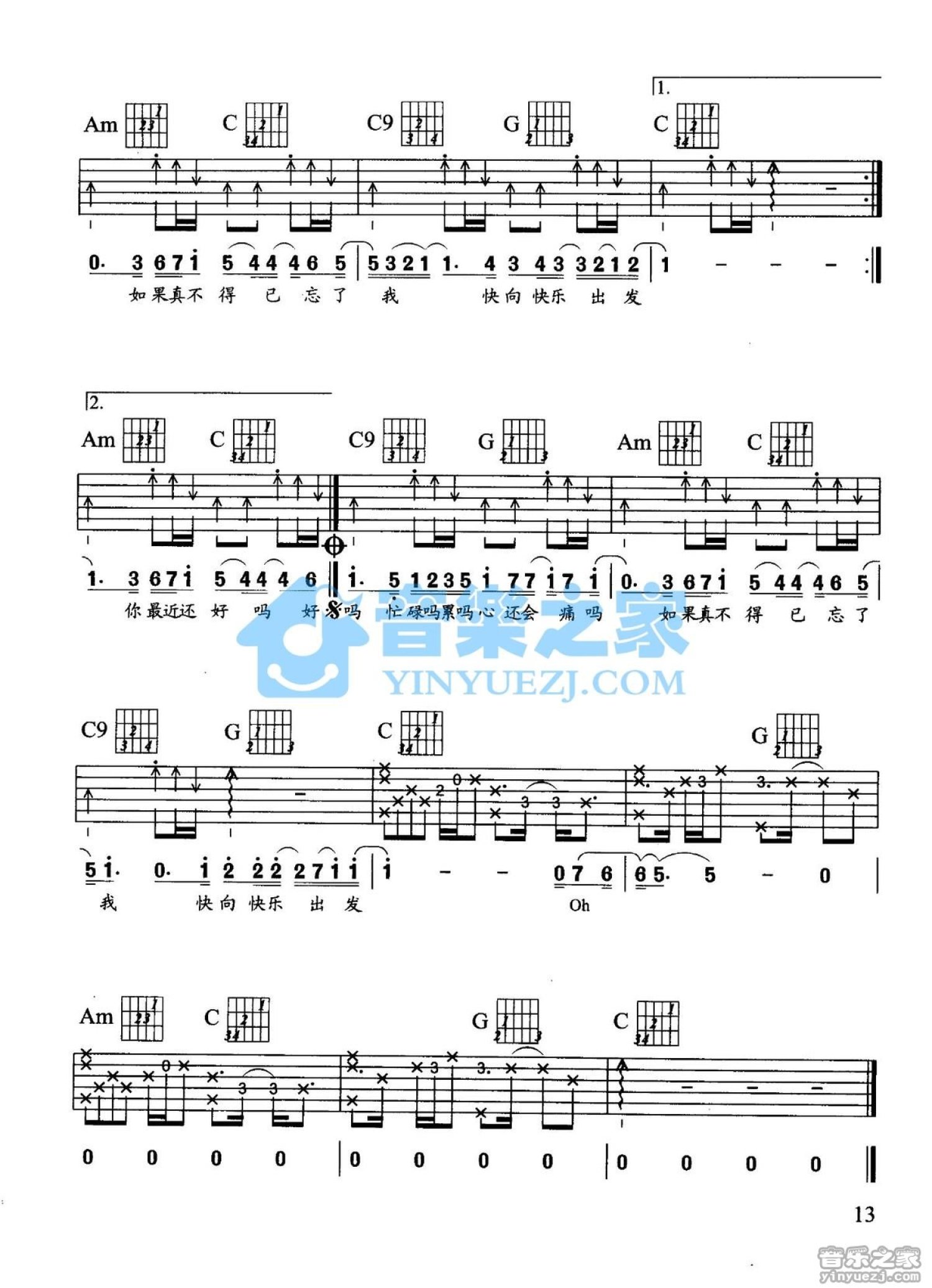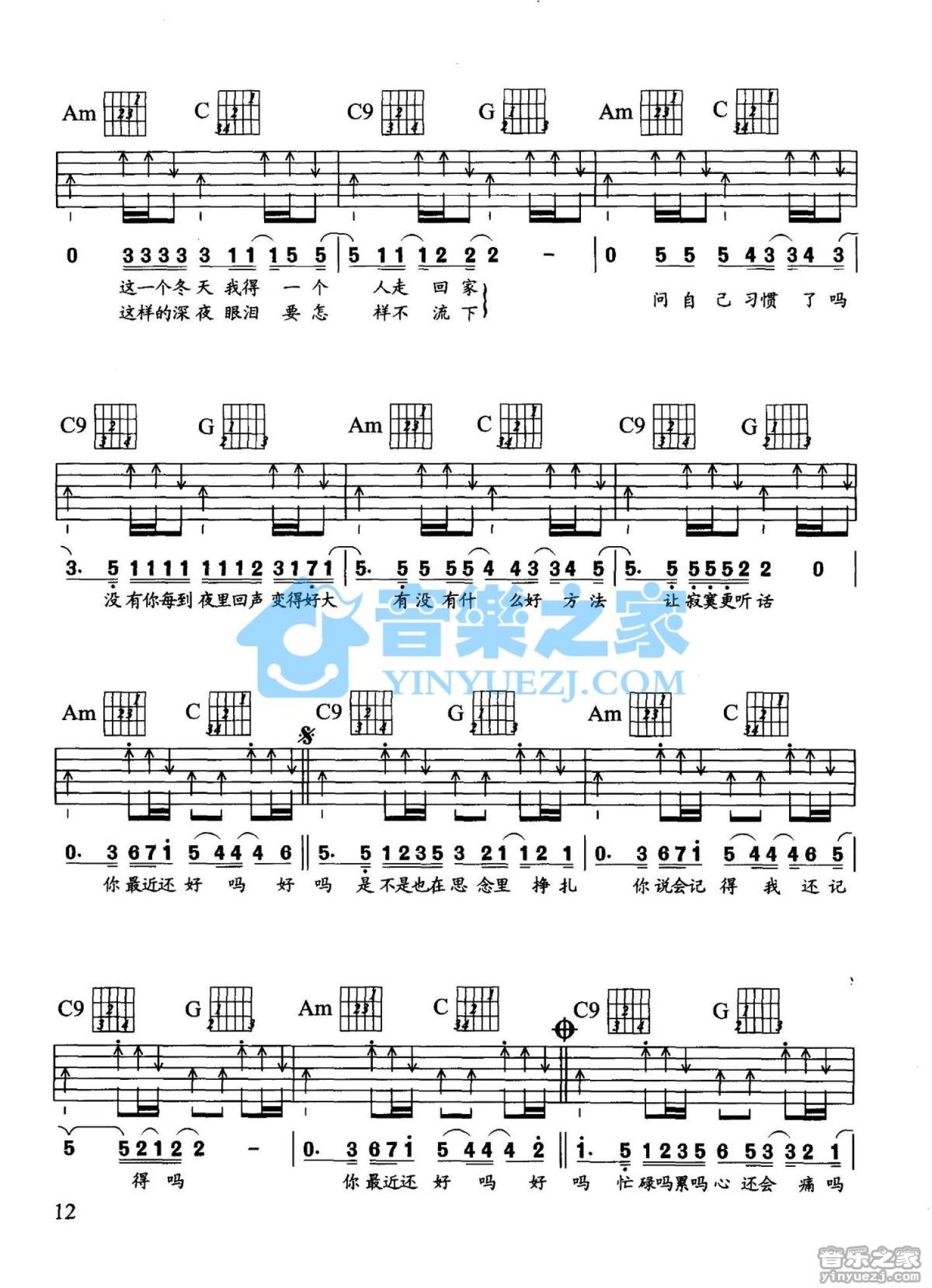 曲谱介绍: C调版《你最近还好吗》吉他弹唱六线谱