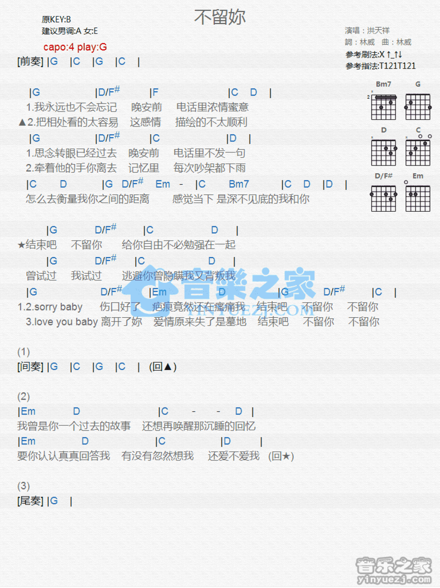 曲谱介绍: G调版《不留你》吉他和弦弹唱谱