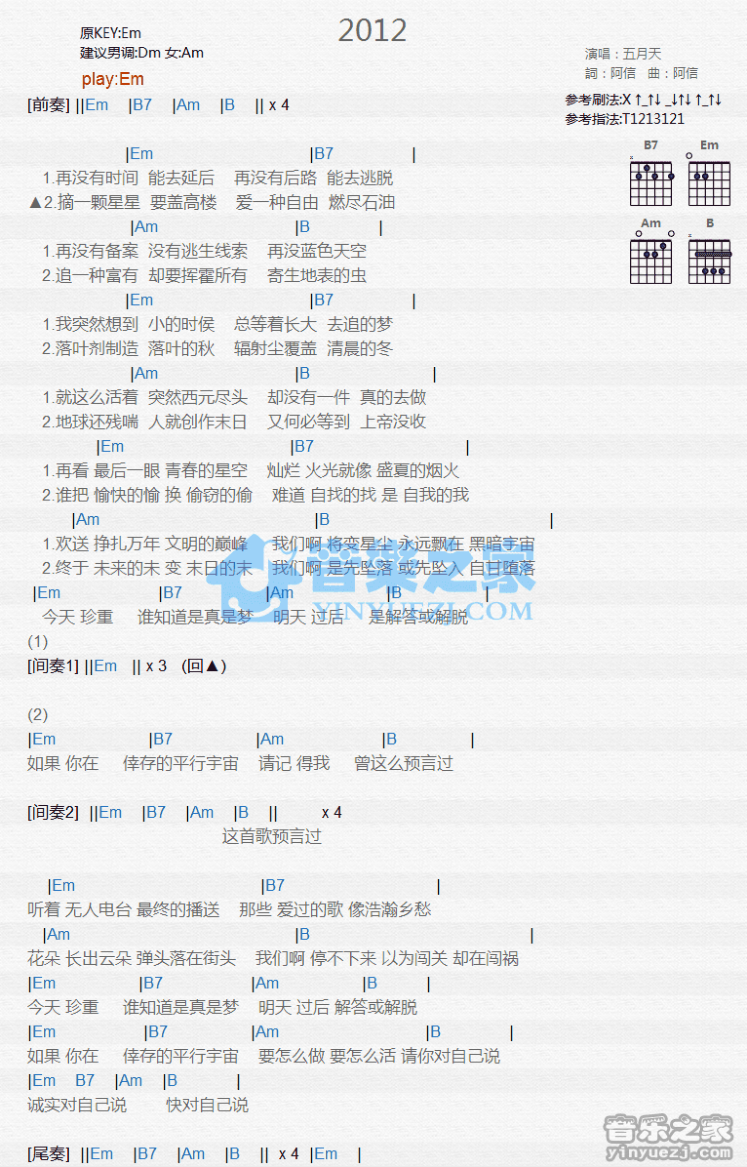 曲谱介绍: Em调版五月天《2012》吉他和弦弹唱谱