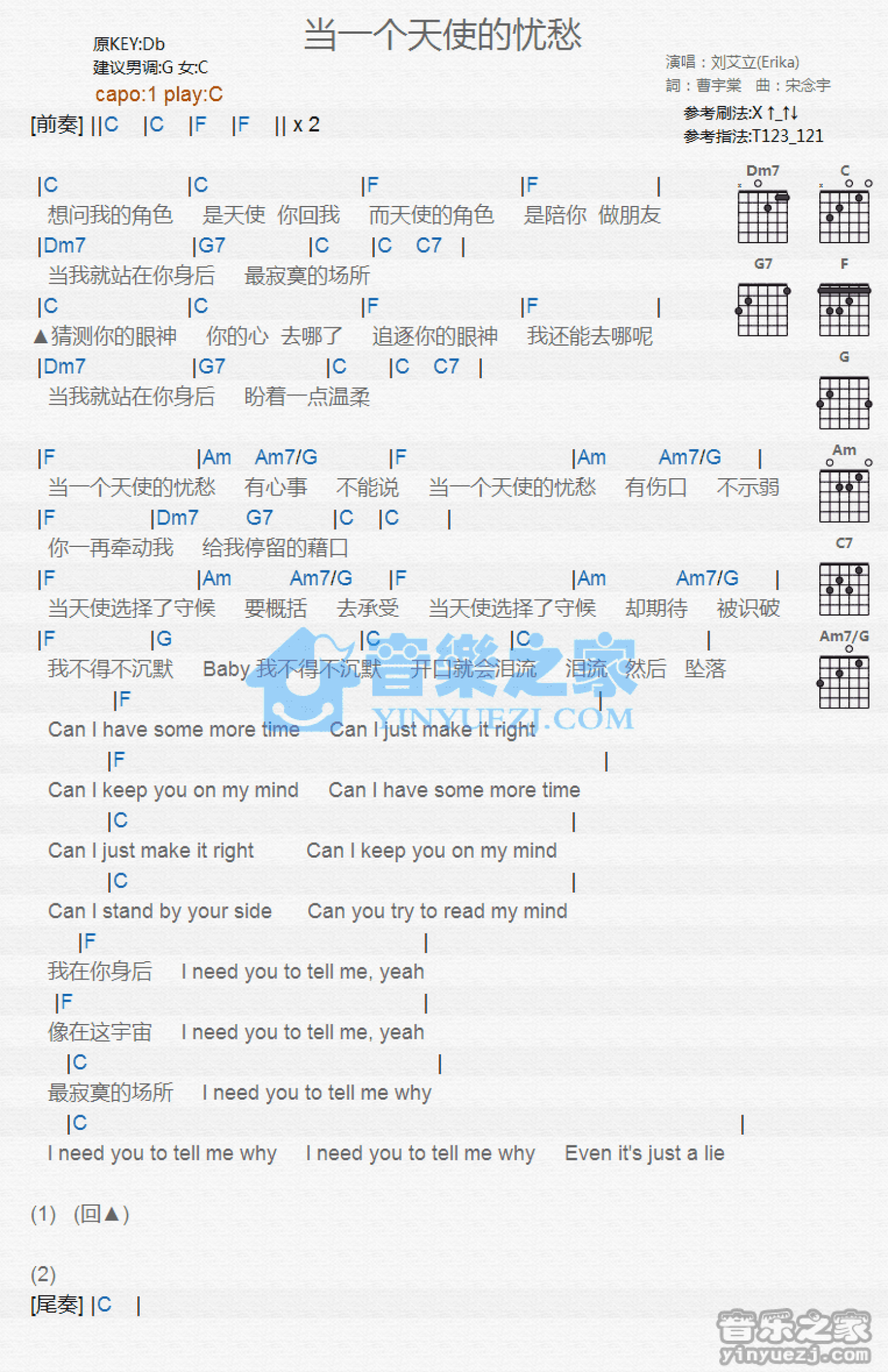 曲谱介绍: C调版刘艾立《当一个天使的忧愁》吉他和弦弹唱谱