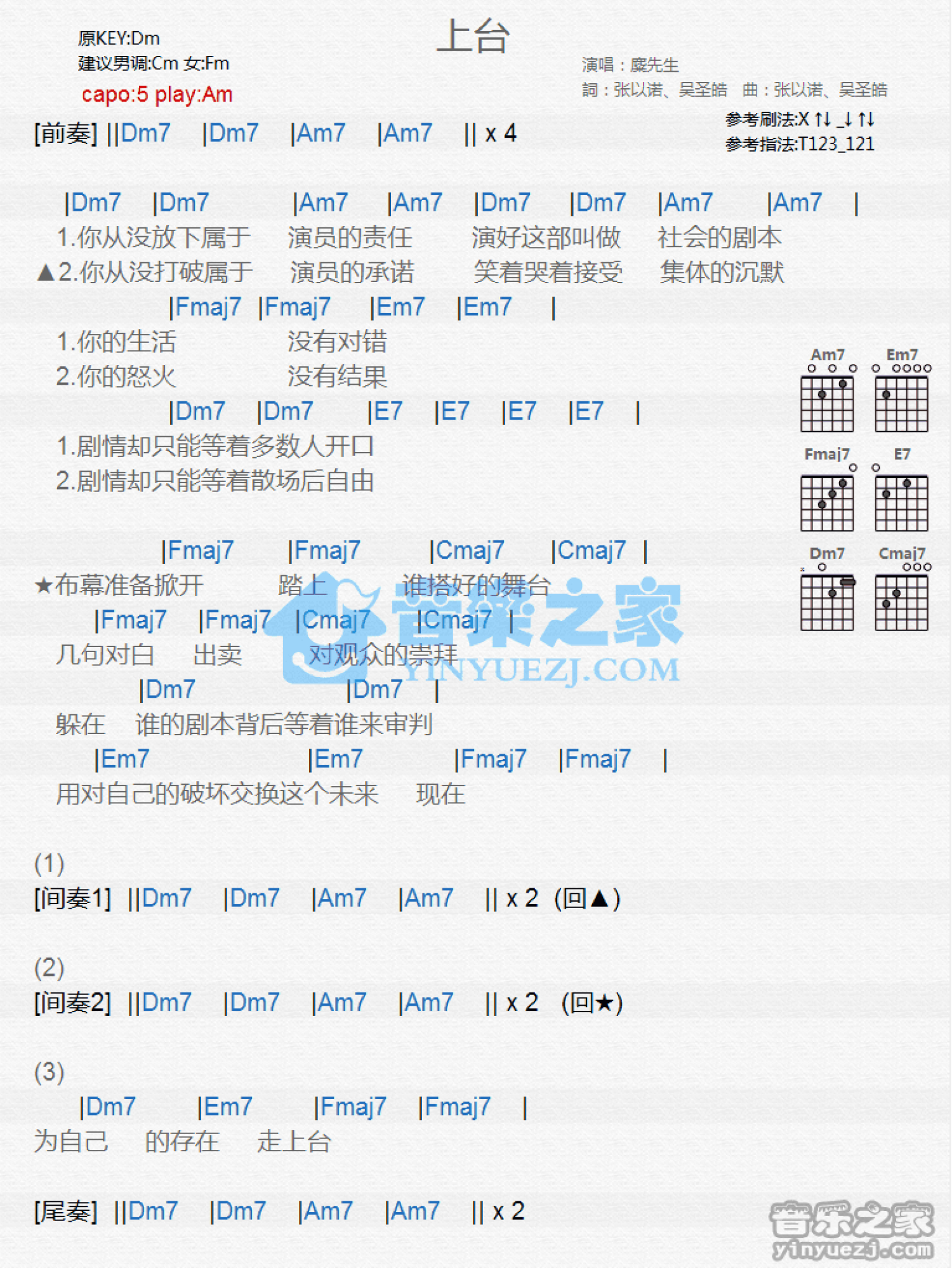 曲谱介绍: Am调版麋先生《上台》吉他和弦弹唱谱