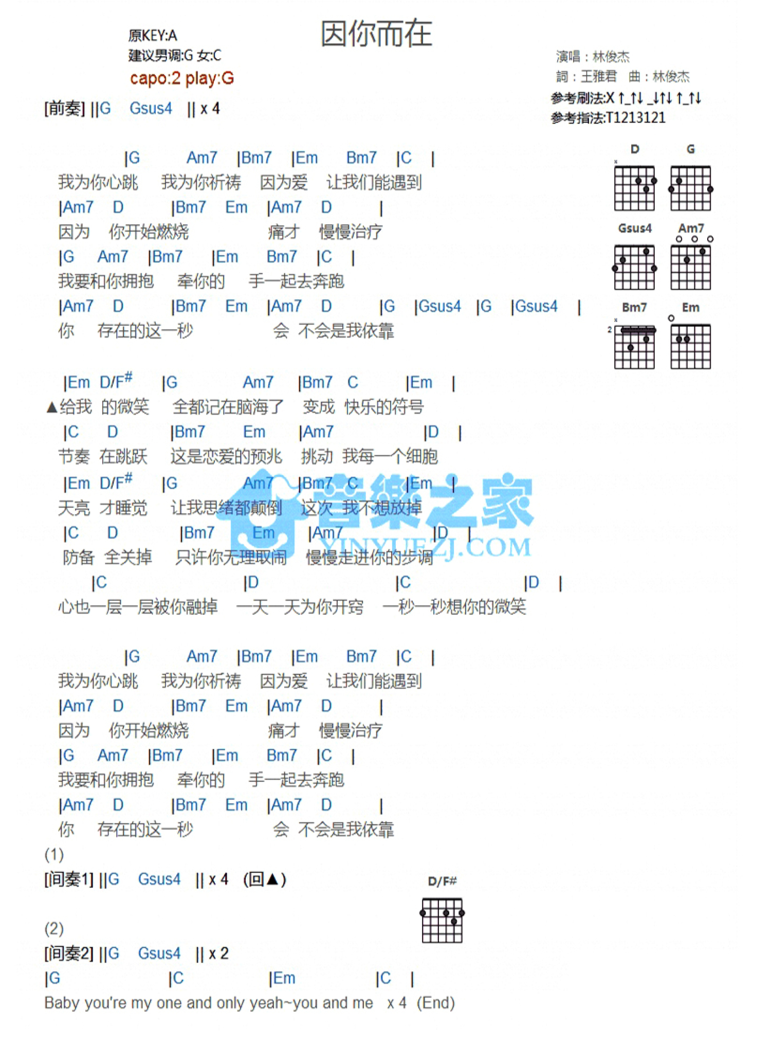 曲谱介绍: G调版《因你而在》吉他和弦弹唱谱
