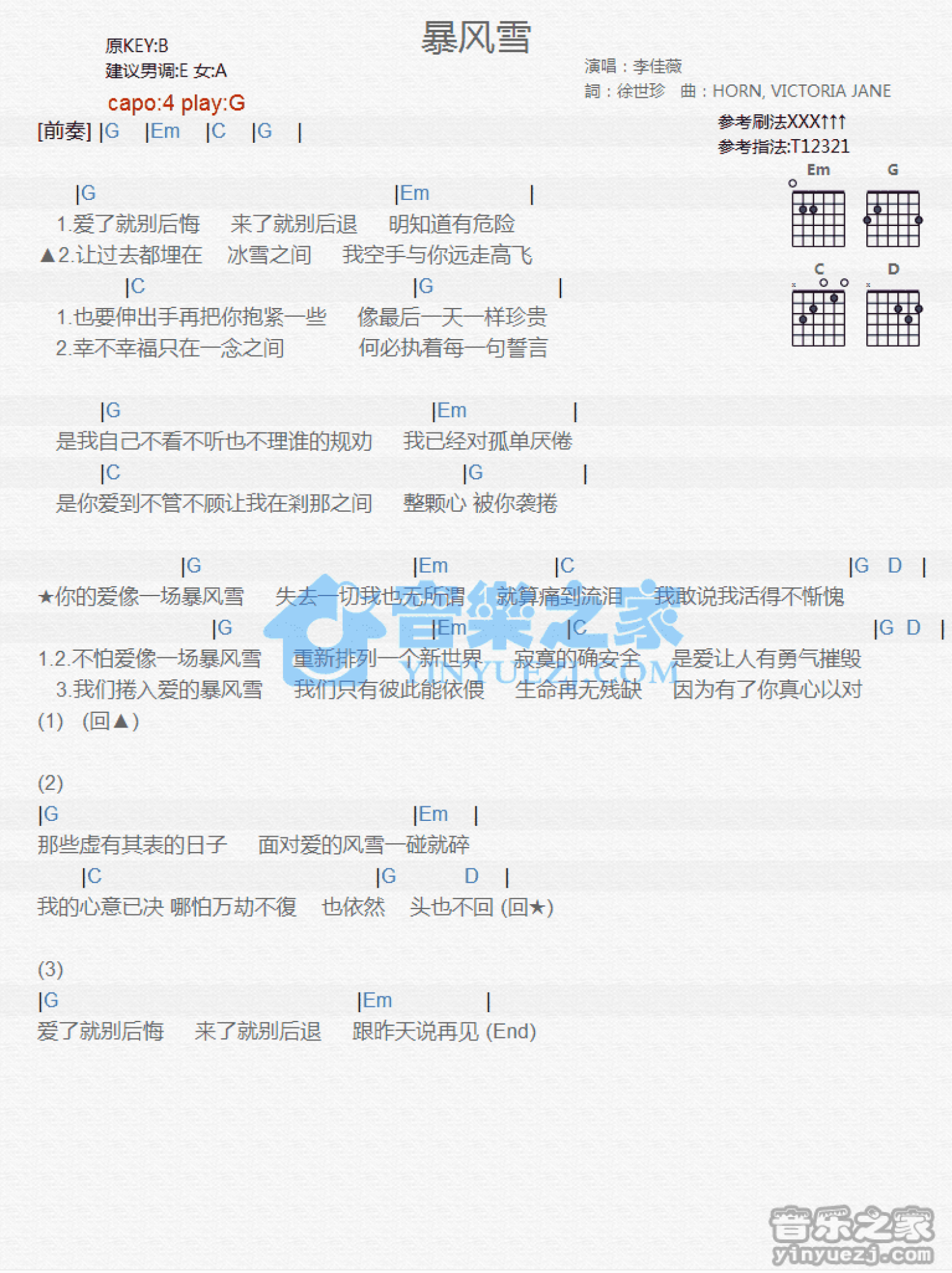 曲谱介绍: G调版李佳薇《暴风雪》吉他和弦弹唱谱