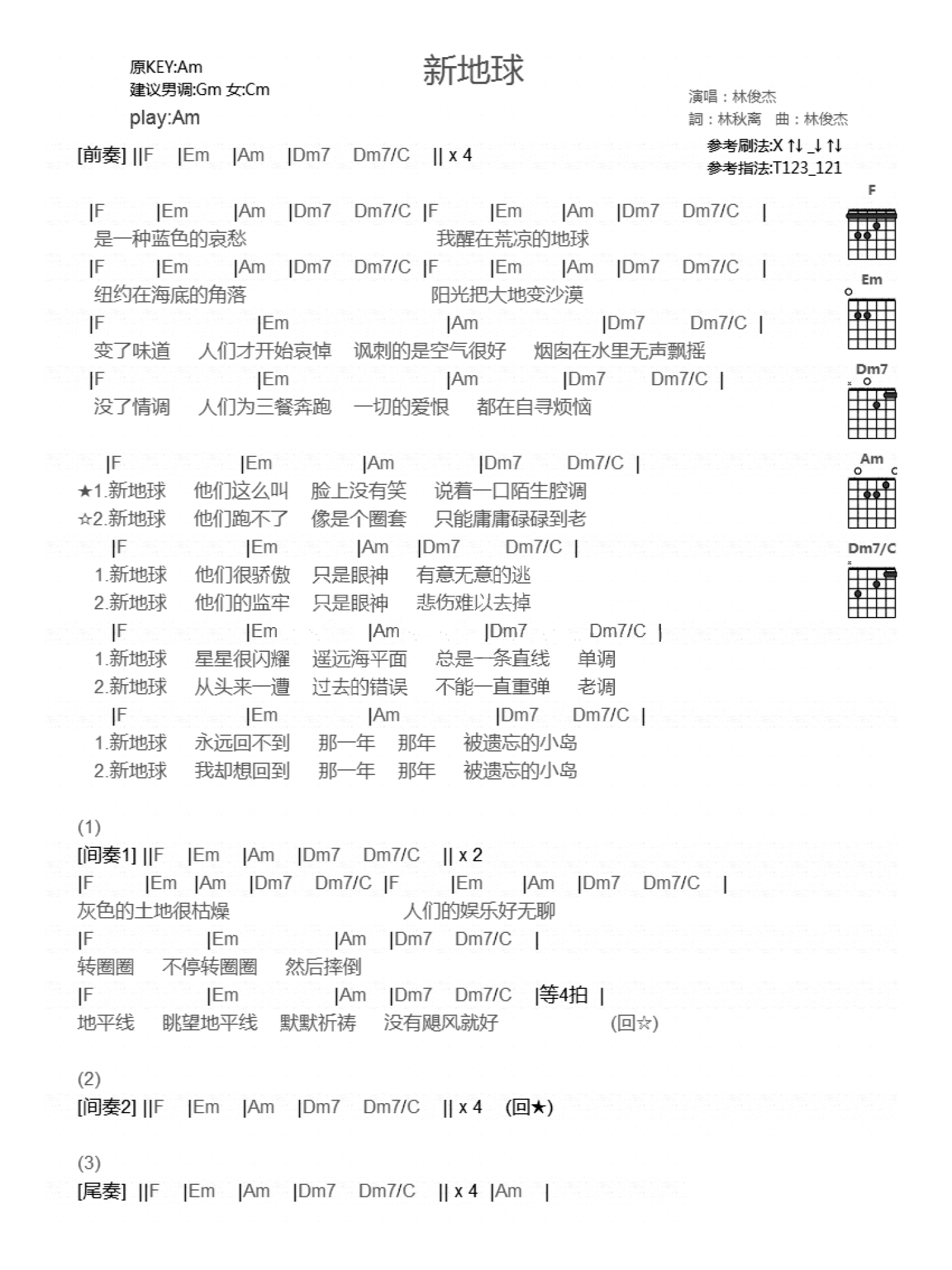 曲谱介绍: Am调版林俊杰《新地球》吉他和弦弹唱谱