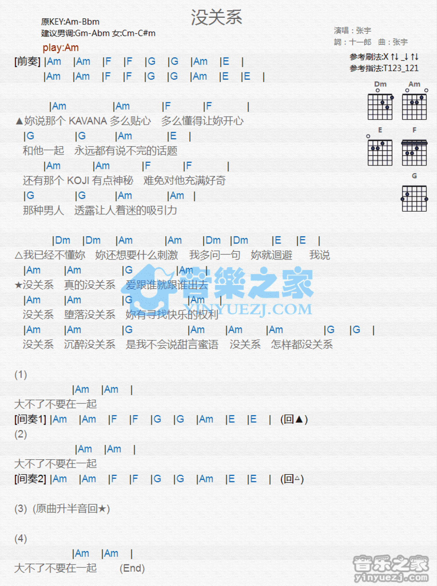 曲谱介绍: Am调版张宇《没关系》吉他和弦弹唱谱