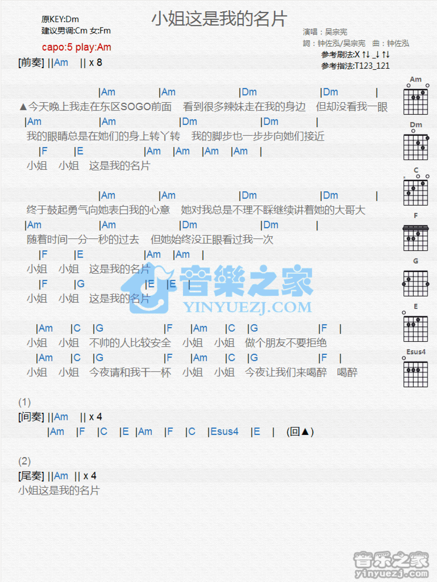 曲谱介绍: Am调版吴宗宪《小姐这是我名片》吉他和弦弹唱谱