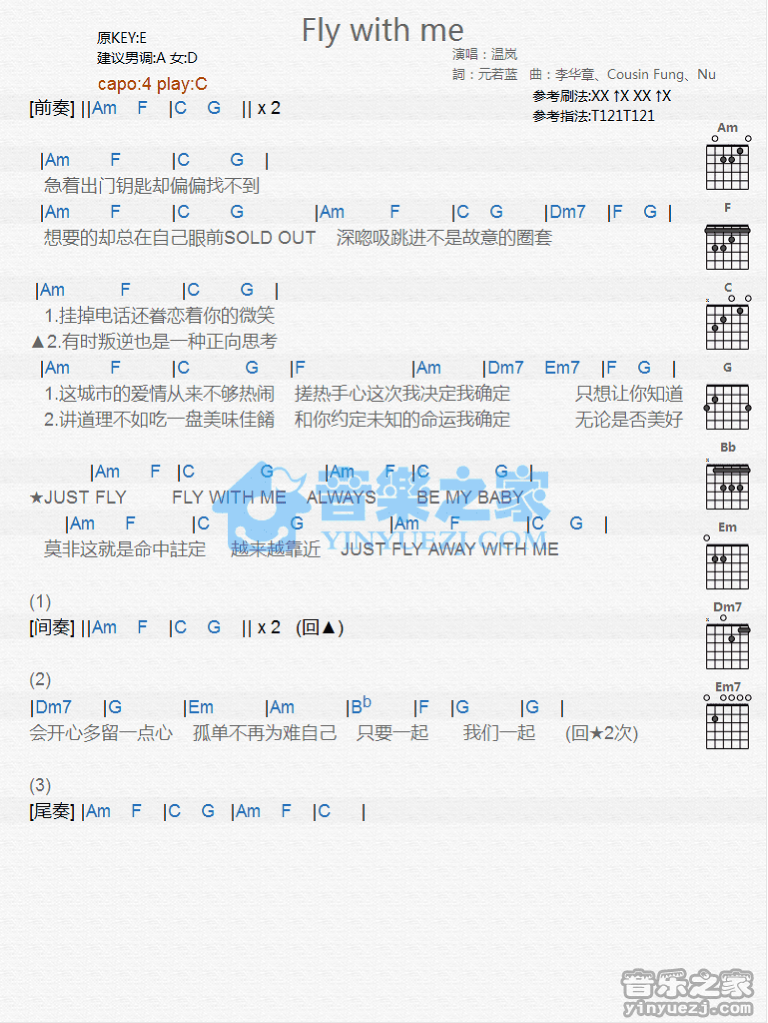 曲谱介绍: C调版温岚《FlyWithMe》吉他和弦弹唱谱