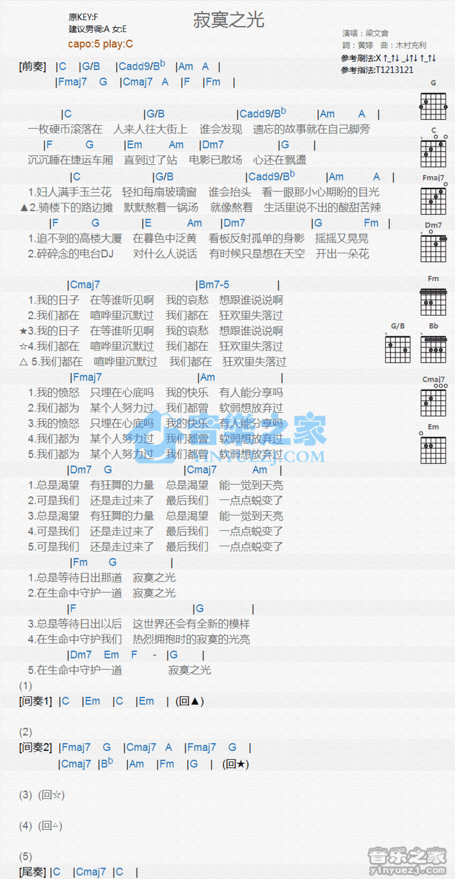 曲谱介绍: C调版梁文音《寂寞之光》吉他和弦弹唱谱