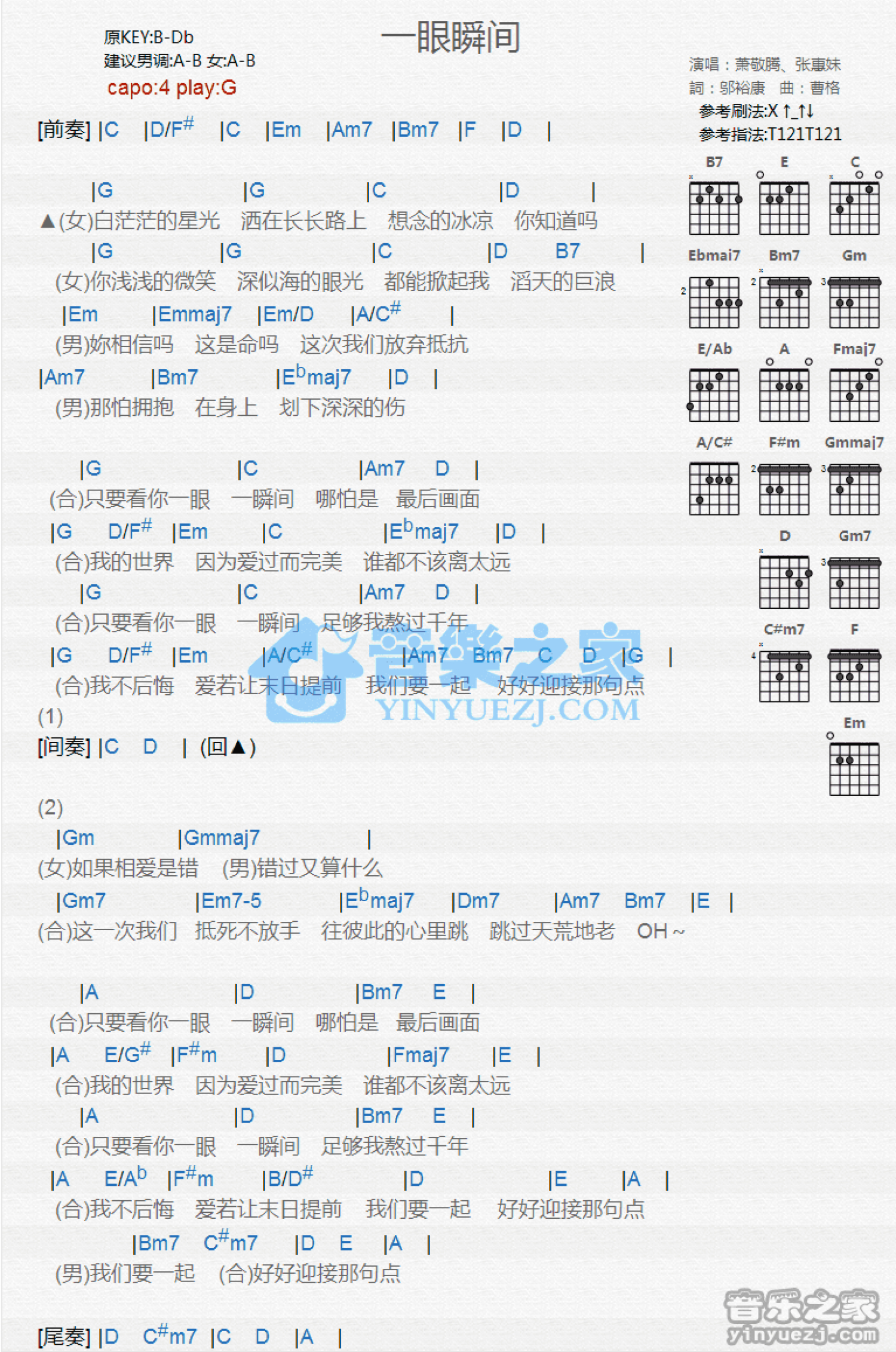 曲谱介绍: G调版《一眼瞬间》吉他和弦弹唱谱