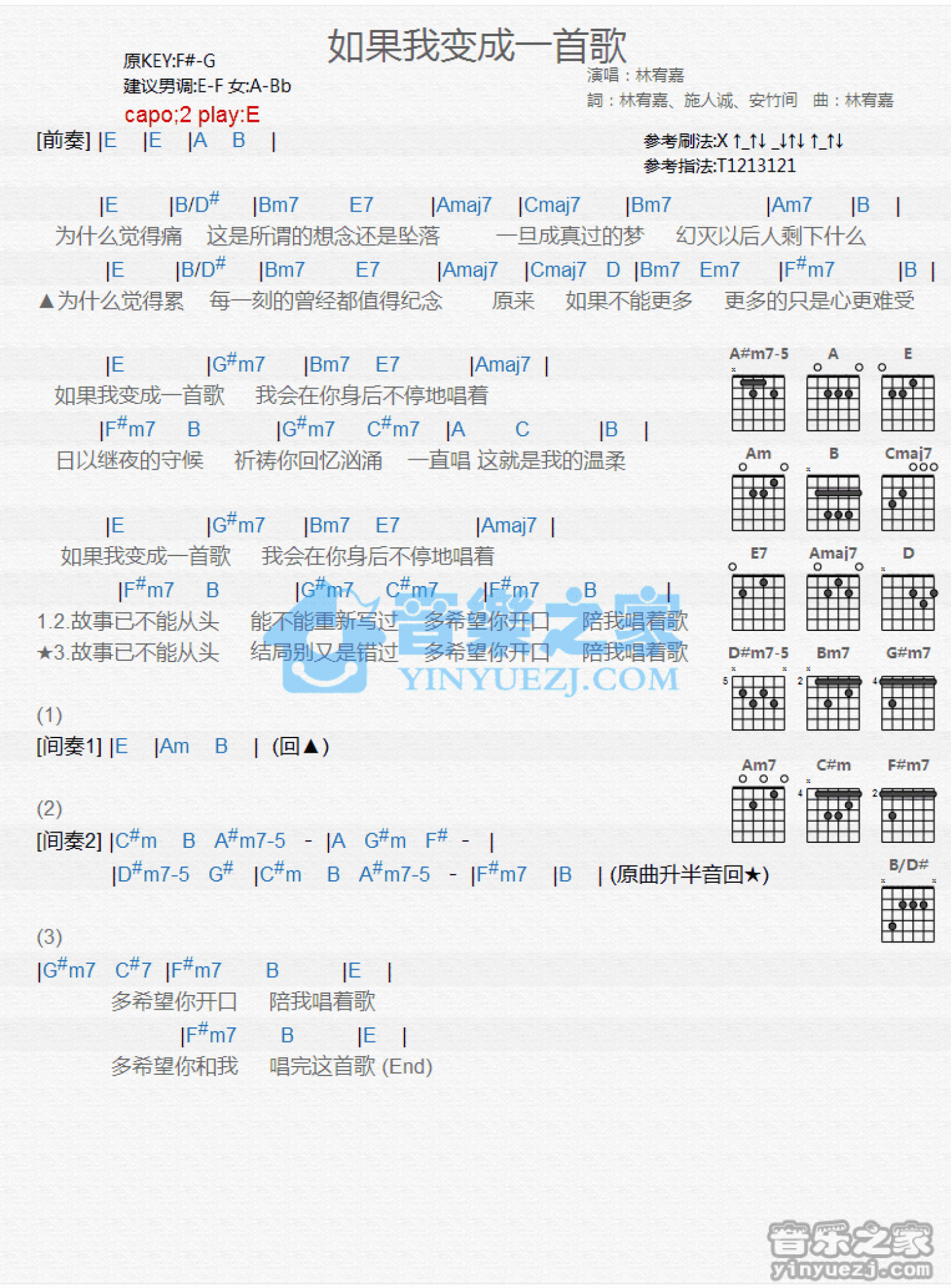 曲谱介绍: E调版林宥嘉《如果我变成一首歌》吉他和弦弹唱谱