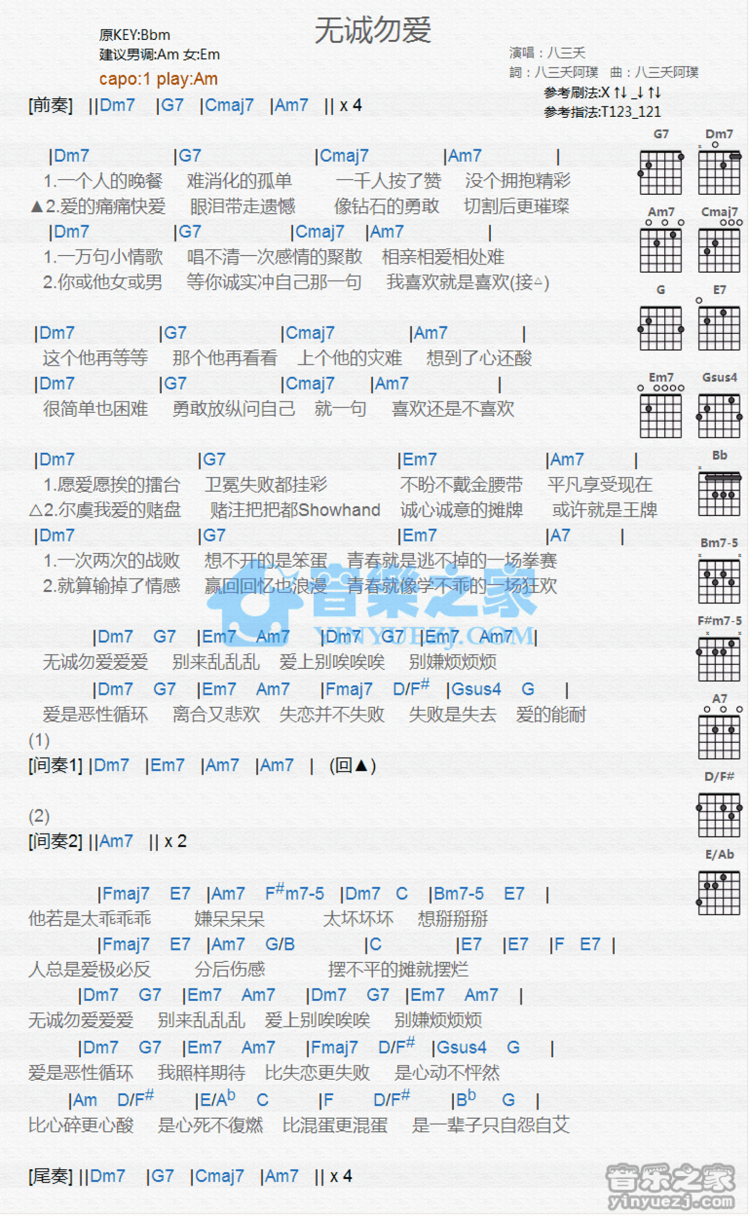 曲谱介绍: Am调版八三夭《无诚勿爱》吉他和弦弹唱谱