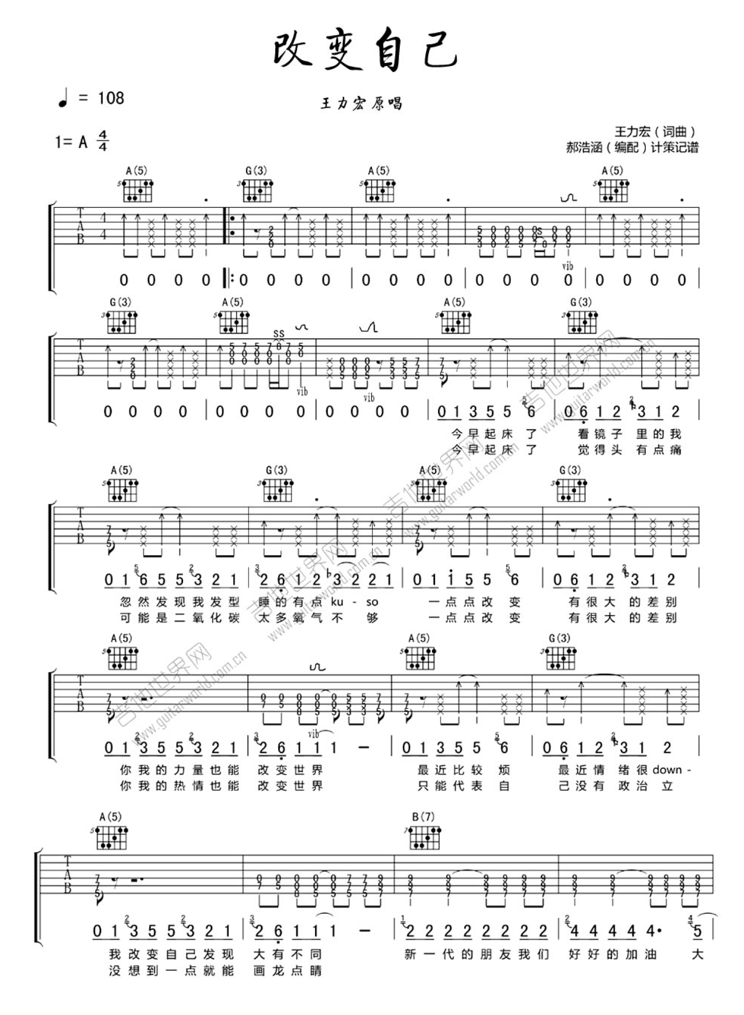 曲谱介绍: A调版 王力宏《改变自己》吉他和弦弹唱谱