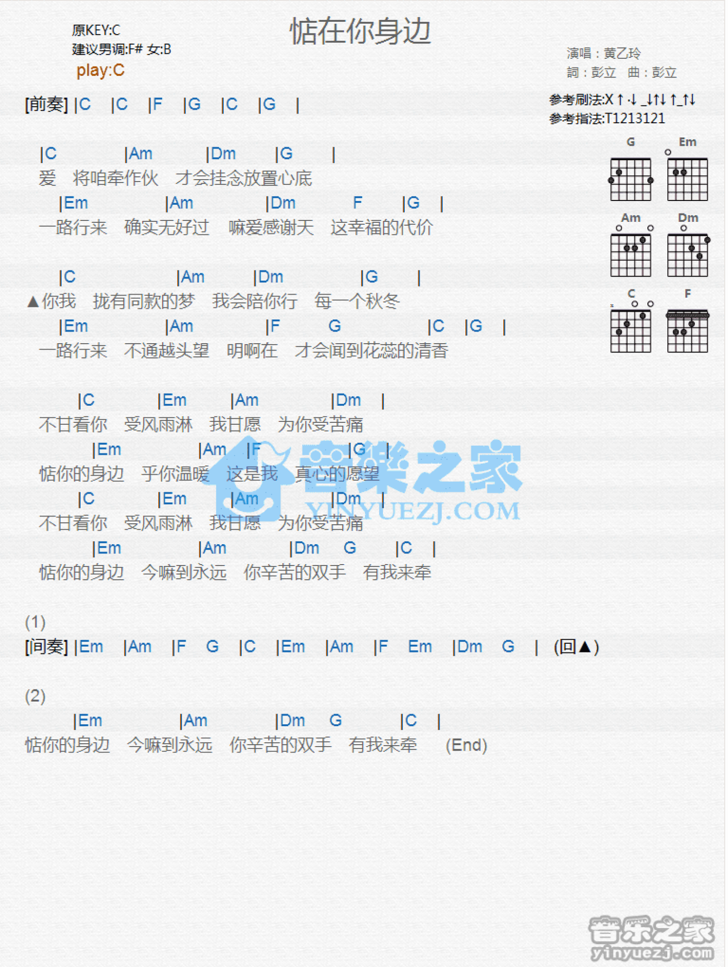 曲谱介绍: C调版 黄乙玲《惦在你身边》吉他和弦弹唱谱