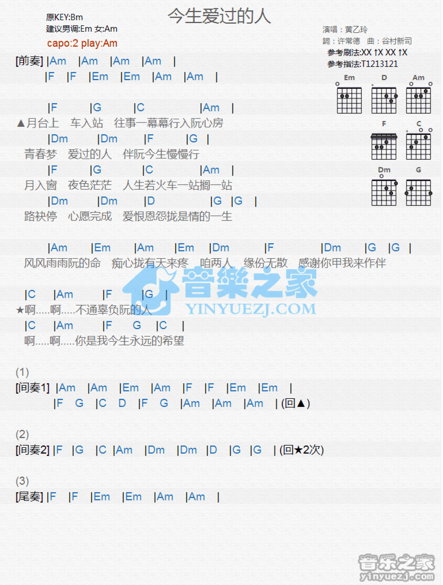 曲谱介绍: Am调版黄乙玲《今生爱过的人》吉他和弦弹唱谱