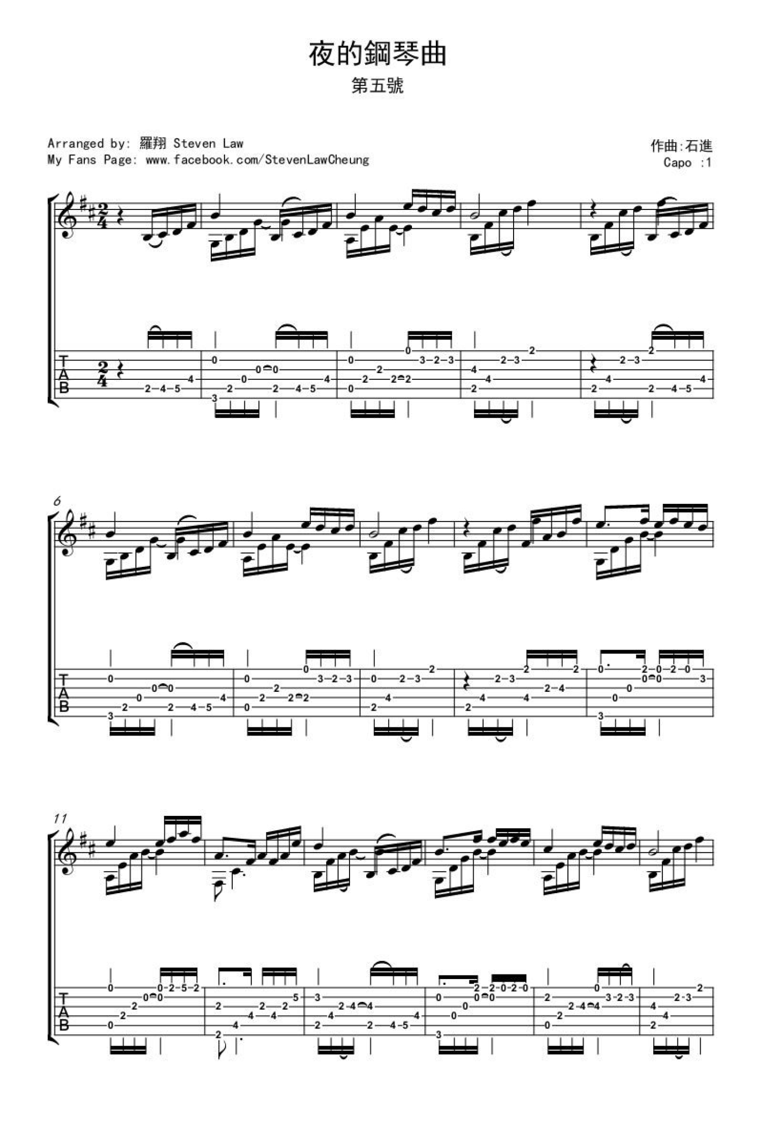 夜的钢琴曲五吉他谱 - 石进 - 吉他独奏谱