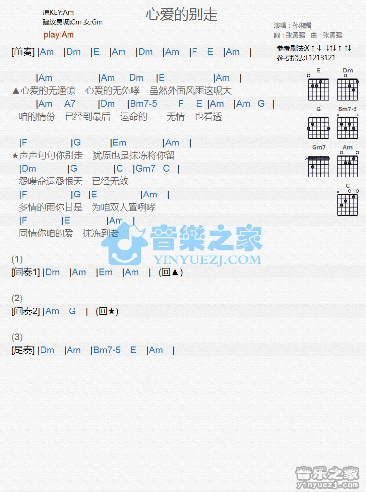 曲谱介绍: Am调版孙淑媚《心爱的别走》吉他和弦弹唱谱