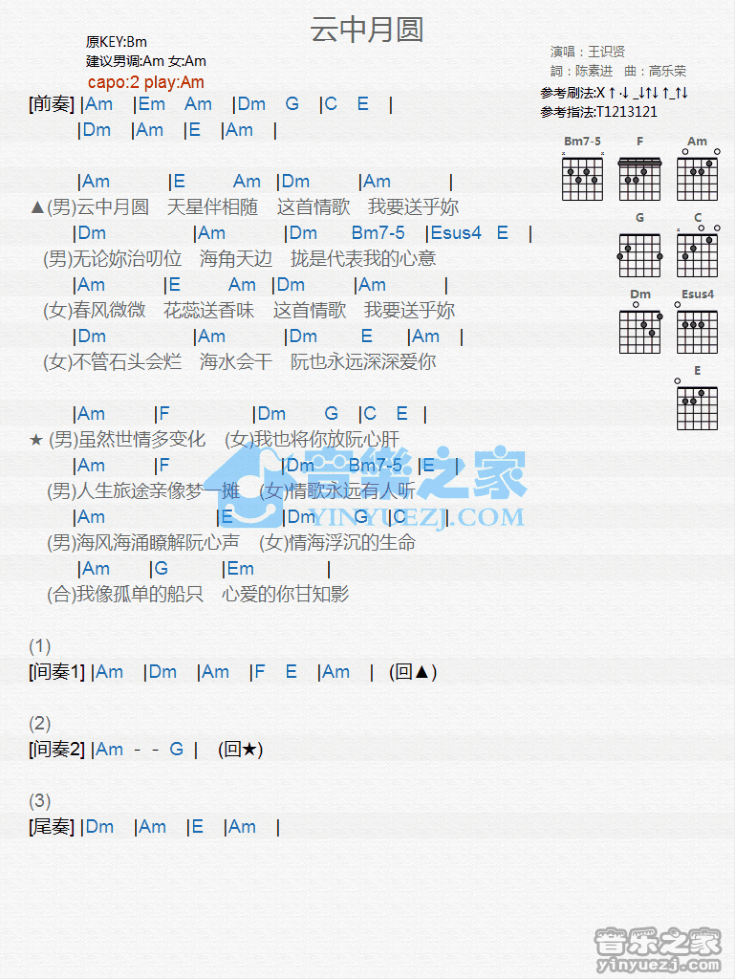 曲谱介绍: Am调版王识贤《云中月圆》吉他和弦弹唱谱