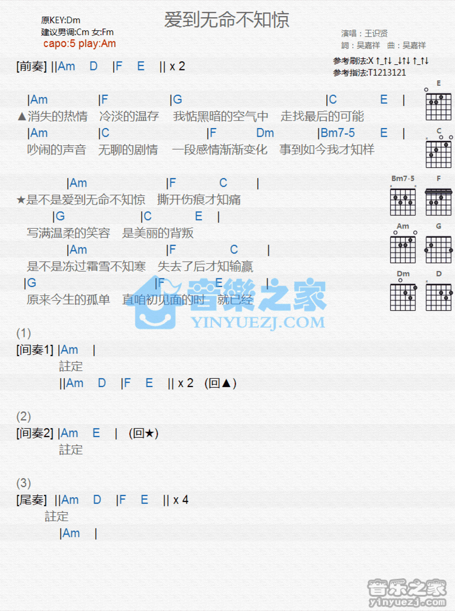 曲谱介绍: Am调版王识贤《爱到无命不知惊》吉他和弦弹唱谱